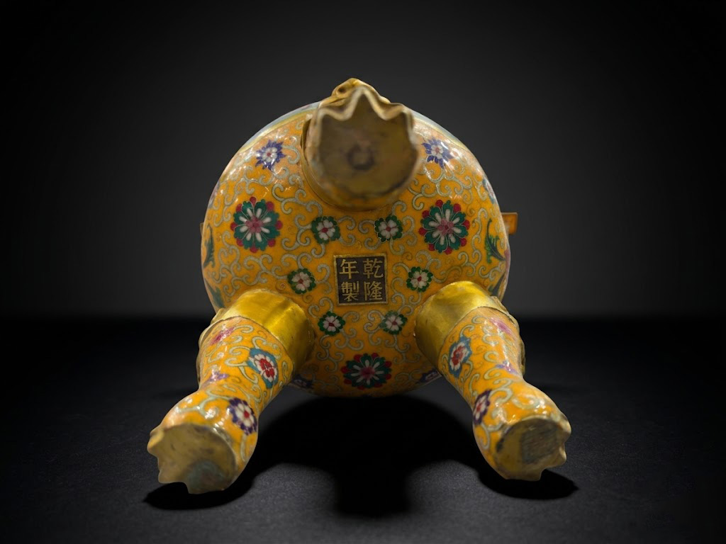 底部书“乾隆年制”四字楷款,笔意规整端庄,与通体装饰风格相一致。金色底座与珐琅彩面相映成辉,不仅强化了视觉层次,也进一步凸显其宫廷御制器的身份属性。