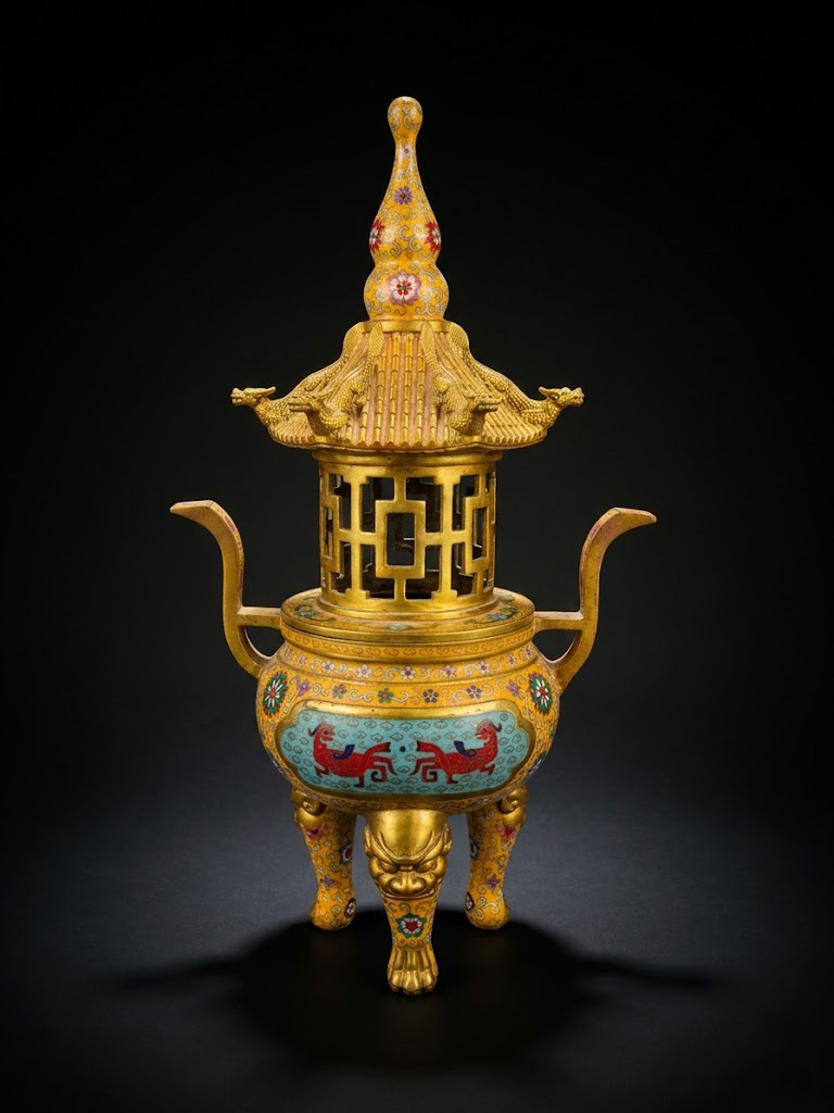 清代乾隆时期,是宫廷工艺高度成熟与审美极致繁盛的阶段。本件铜胎掐丝珐琅塔式香薰炉,融宗教礼制与宫廷陈设于一体,以严谨的结构、繁复的纹饰与华丽的色彩,共同构建出一件兼具观赏与礼佛功能的典型宫廷器物。