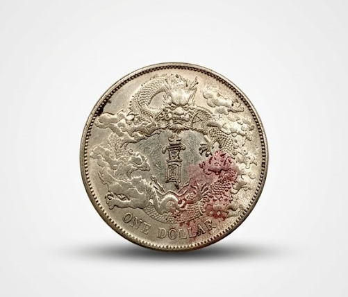 细观之下,龙鳞排列细密且富有节奏感,雕刻层次分明,体现出当时雕模工艺的精细程度。中央直书“壹圆”面值,下方辅以英文“ONE DOLLAR”,中西文字并列,反映出近代货币体系与国际接轨的时代特征。