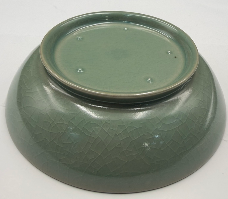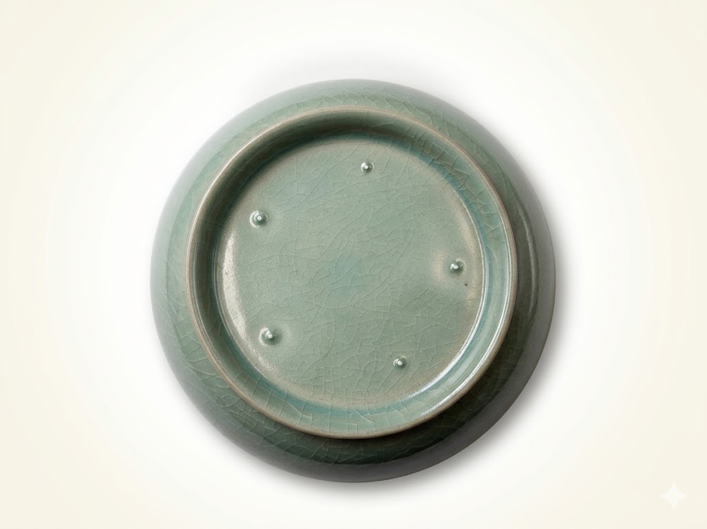 底部圈足外撇,留有五个细小支钉烧痕,露胎呈香灰色。汝窑特有的“裹足支烧”工艺彰显其皇家御用瓷器身份,同时体现宋代制瓷工艺的严谨与讲究。