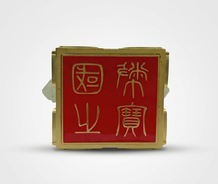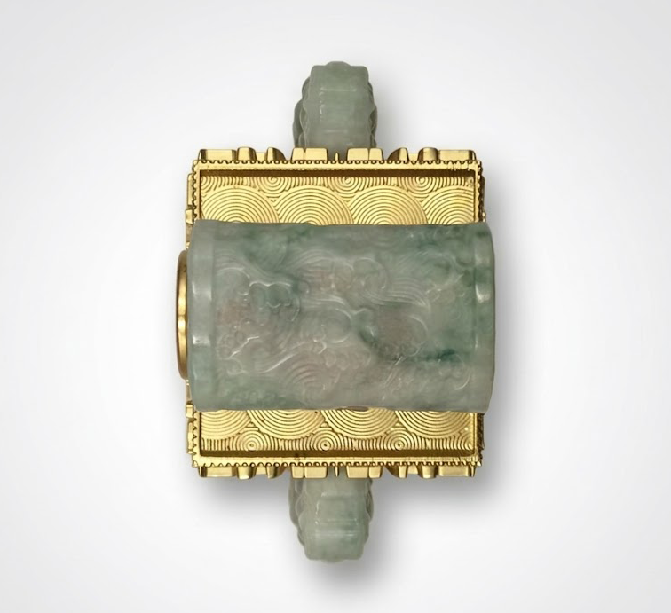 玺身正面采用精细的金质浮雕工艺,饕餮纹与祥云纹层层铺展,线条遒劲而富有节奏感。中央镶嵌长方形翡翠主石,色泽青翠凝润,与周围金饰形成鲜明对比。两侧辅以透雕翡翠龙首,神态威严灵动,使整体构图更显立体与生动,寓意尊贵与祥瑞并存。
