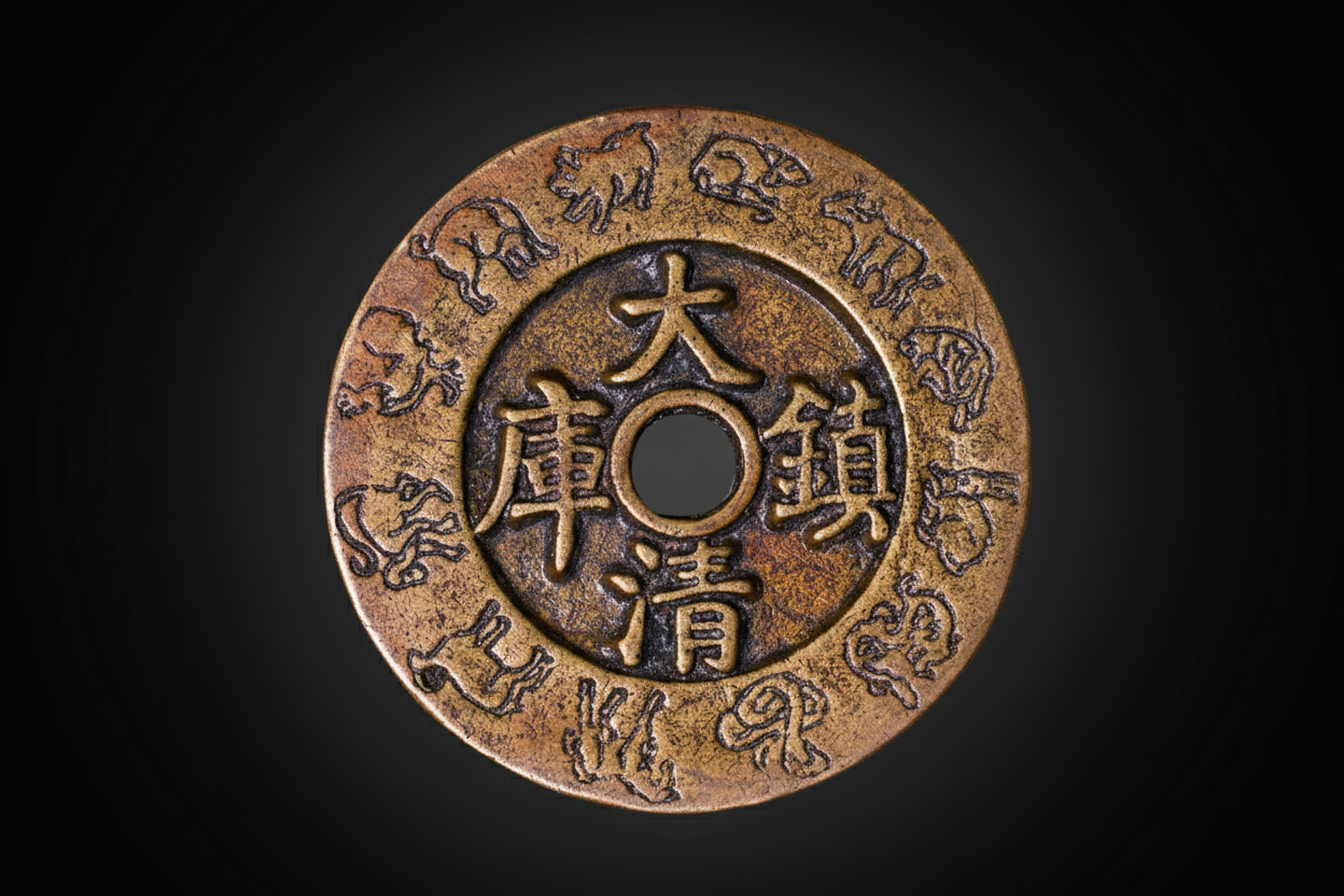 中央铸“大清镇库”,直陈用途,象征护佑钱库、财源聚敛。外环同饰十二生肖,与正面呼应,寓守护与繁荣之意。图案深峻饱满,铸造工艺精湛。