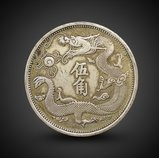 钱币正面中央铸“伍角”字样,外围环饰一条盘旋腾飞的祥龙,龙首昂扬,口衔火珠,线条精细,鳞爪毕现,象征着清廷的皇权与威严。龙纹布局饱满,雕刻工艺精湛,体现了当时造币局的高超制币水平。