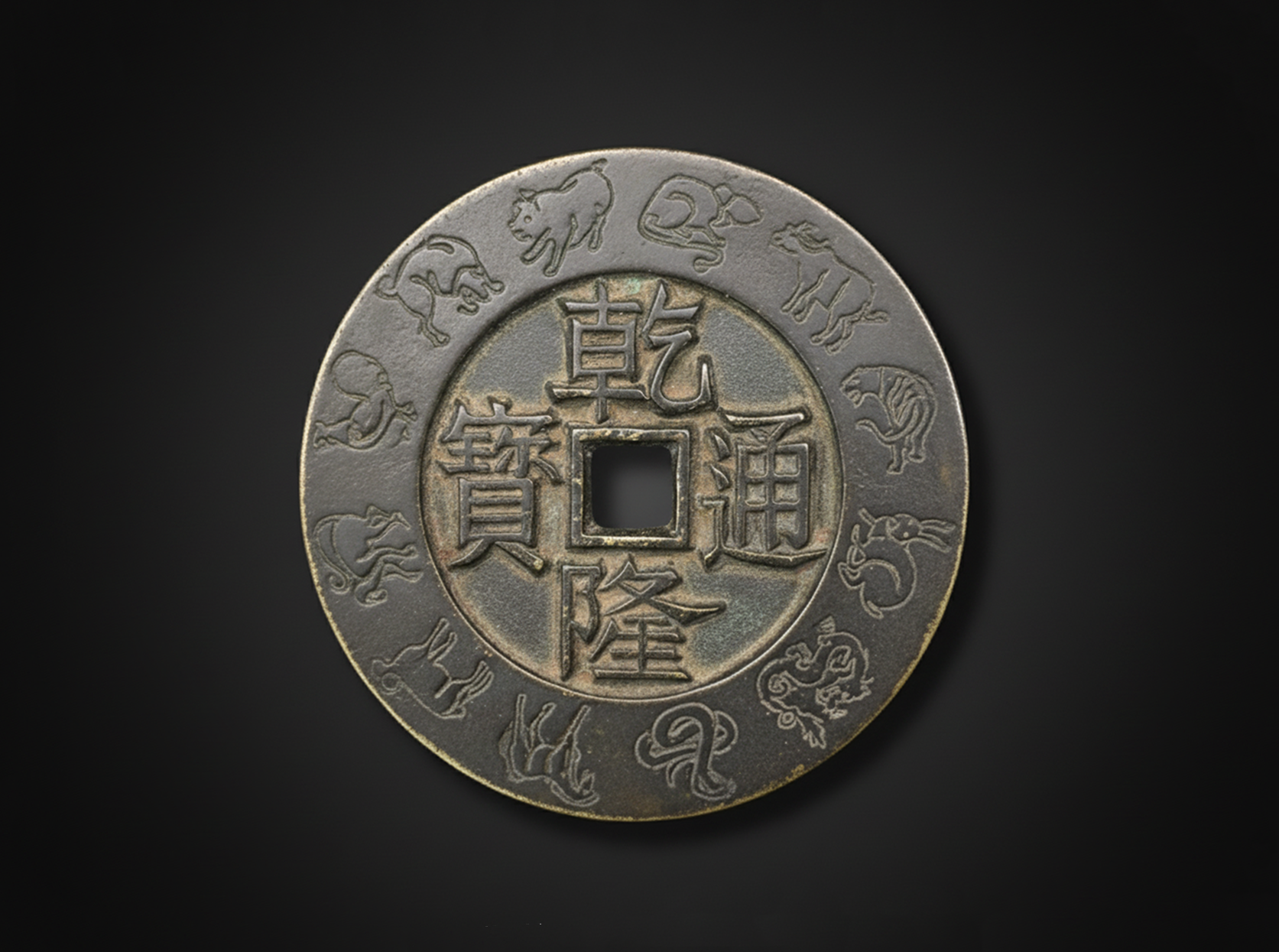另一面则以“乾隆通宝”为内郭铭文,继承清宫年号钱制式,与“大清镇库”成对呼应,象征“镇国与通财”并重。外环同样铸饰十二生肖图案,与前者构成双面异文、对版相合的完整组合。