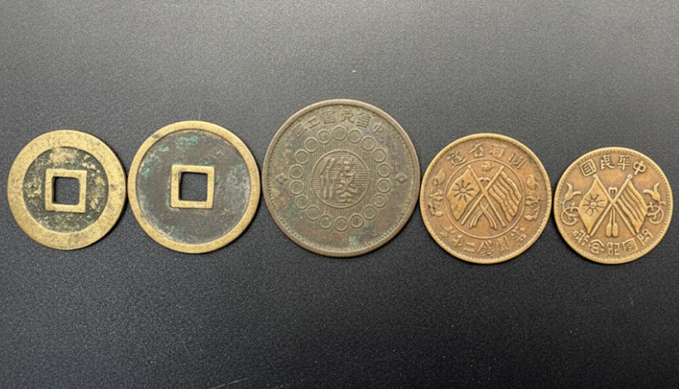 这组钱币共五枚,其材质主要为铜或铜合金,表面呈现出古朴的红褐色或黄褐色,并伴有自然氧化的绿色铜锈,这是年代久远铜质货币的典型特征。这批钱币涵盖了中国清代末期至中华民国时期的货币演变历程。