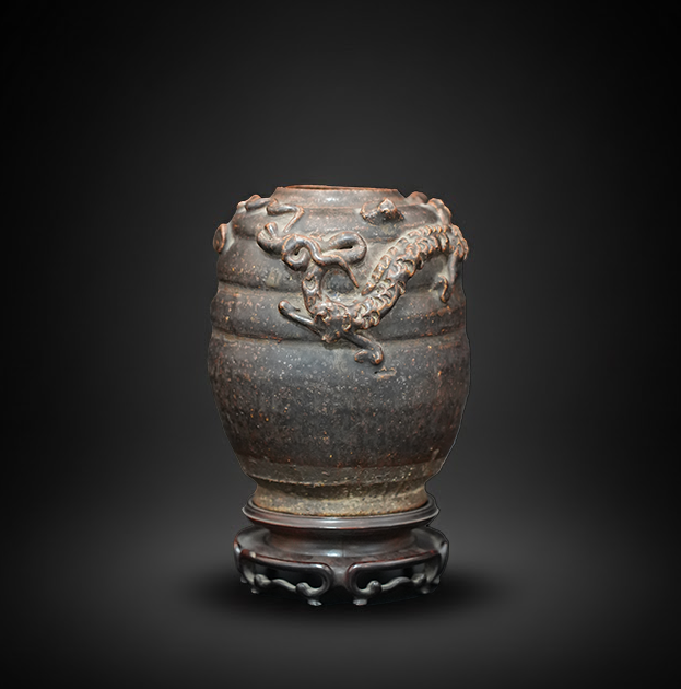 岁月流转,酱釉表面自然开片,细微的窑变折射出时间的温度。贴塑的龙纹在光影间愈显立体灵动,仿佛盘旋于云雾之中,象征祥瑞与力量。深沉的釉色与腾跃的龙形相互辉映,使整器在厚重中蕴含生气,在古朴中流露灵性。