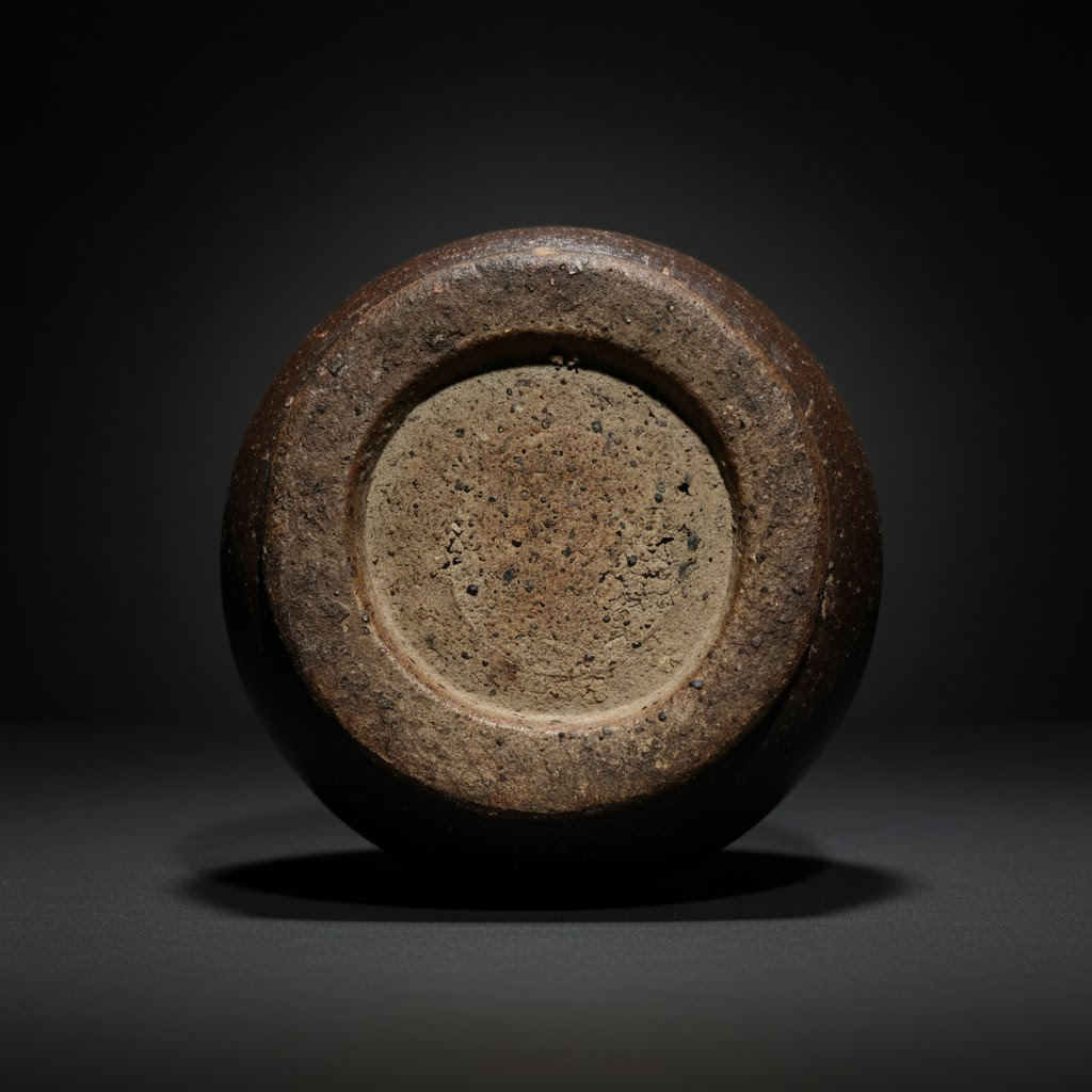 罐底平切宽圈足,露胎处呈土黄色,颗粒感明显,可见火石红斑与砂粒痕迹,胎质坚实厚重。胎釉分界清晰,展现出明早期民窑真实的烧造工艺。