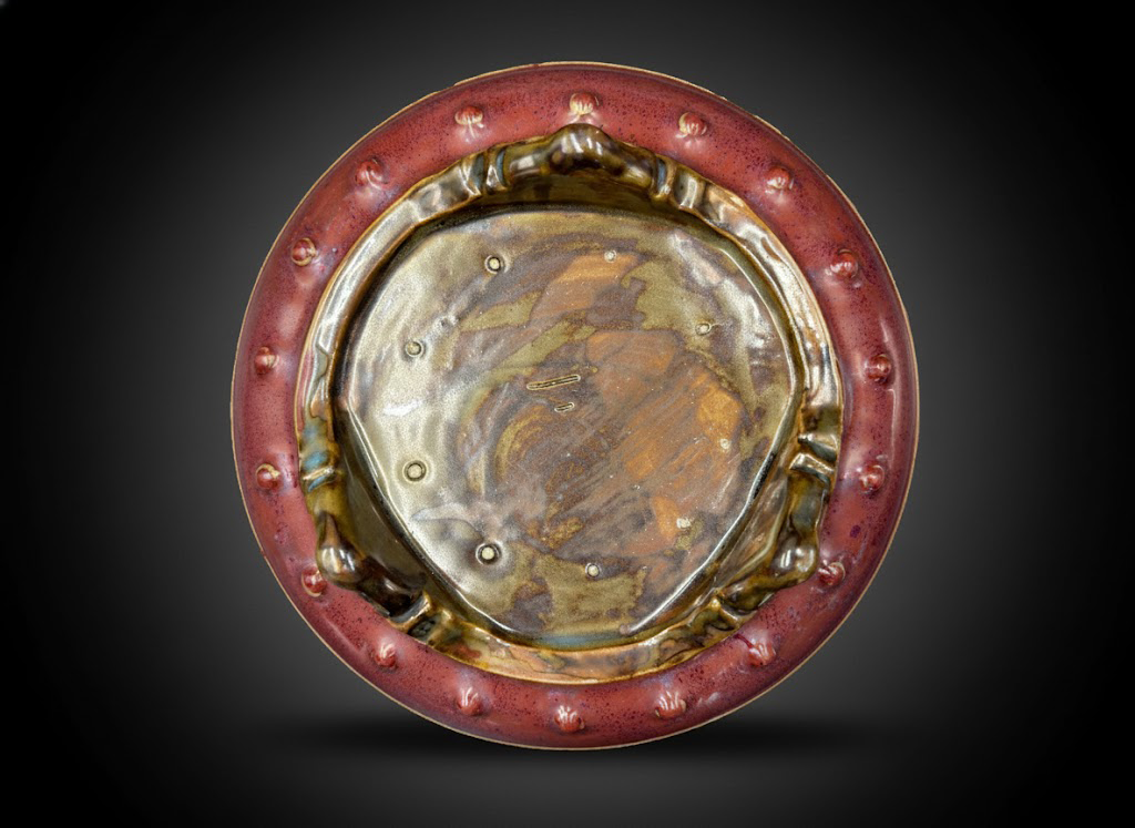 器物侧面弧腹饱满,满施玫瑰紫釉,色泽深邃艳丽。上下各饰一圈凸起鼓钉,古朴端庄;底部三如意头足支承,曲线柔美,凝重中见灵动,尽显钧瓷之美。