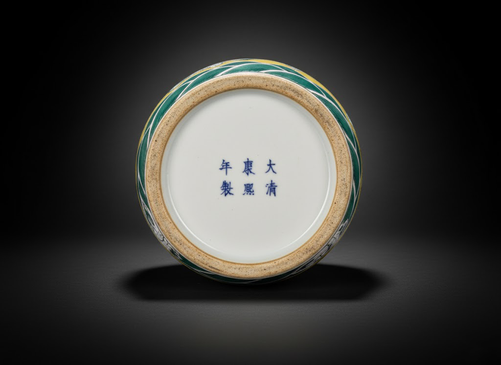 主体通体施以明黄釉,釉色明快温润,象征尊贵与祥瑞。罐身描绘一条腾云驾雾的青绿龙纹,龙首昂扬,鳞爪劲健,穿梭于五彩祥云之间,口衔火珠,气势非凡。罐底绘以翻卷海浪,与云纹相映成趣,寓意“龙腾四海”,象征权力、富贵与昌盛。罐口沿饰如意云头纹,构图饱满而层次分明。