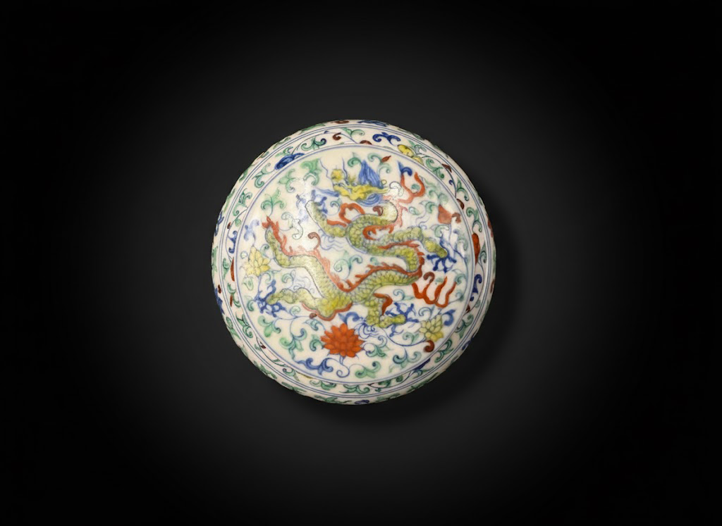 罐盖圆润精致,以细腻的斗彩技法绘制应龙、云纹、莲花与灵芝等吉祥纹样。画面用色淡雅而富层次,釉上红、绿、黄、紫诸彩与釉下青花相映成趣,体现了成化时期独有的“青花作骨、五彩为衣”的艺术格调。