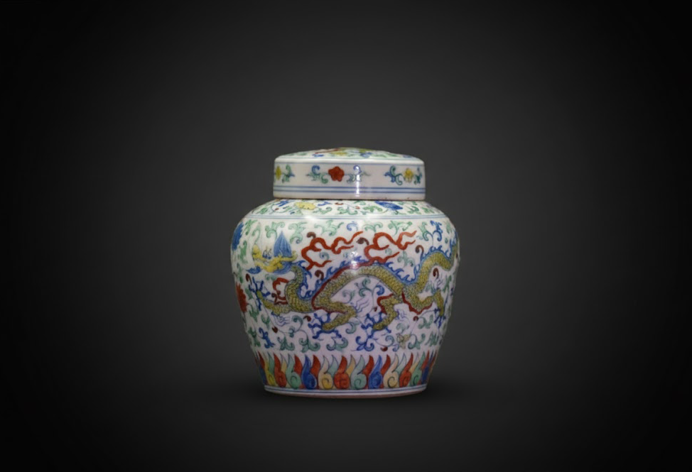 整器比例匀称,直口短颈,丰肩敛腹,造型优雅。罐体以一条斗彩应龙为主体纹饰,龙身姿态矫健,色泽黄绿交辉,配以缠枝花卉、海水江崖纹作衬托。整体画面疏密有致,釉质温润柔和,青花与彩料交相辉映,充分展现出成化斗彩的精雅之美。