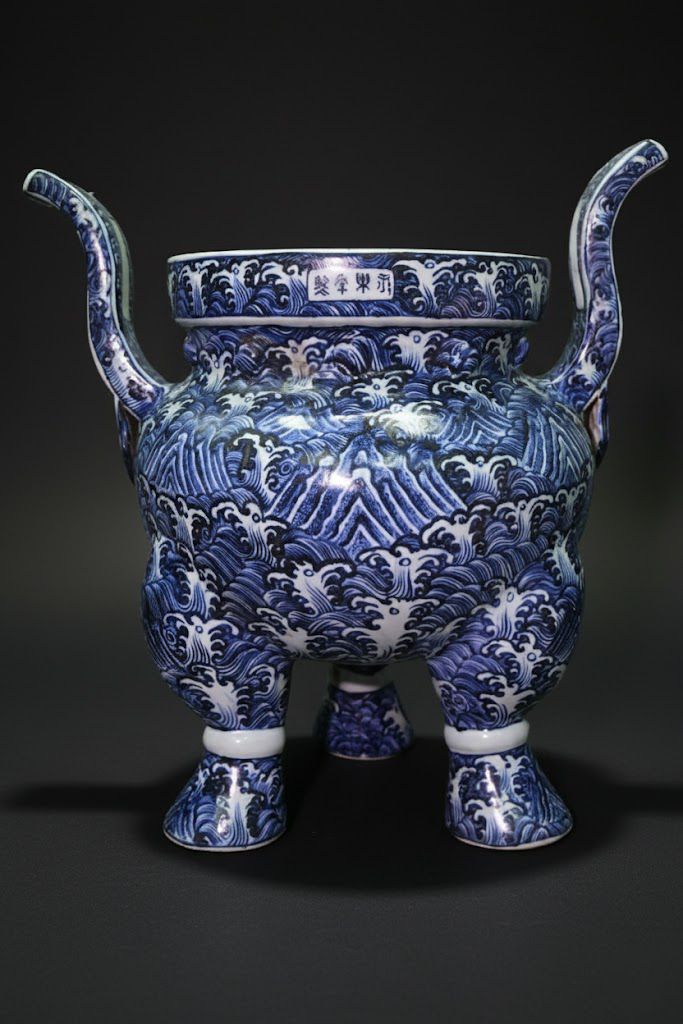 三足青花双耳海水大炉不仅是一件陈设之器,更是一段明代御瓷工艺的见证。其雄浑的造型与雅致的青花发色,共同构筑出永乐瓷艺“文武并融”的艺术精神。
