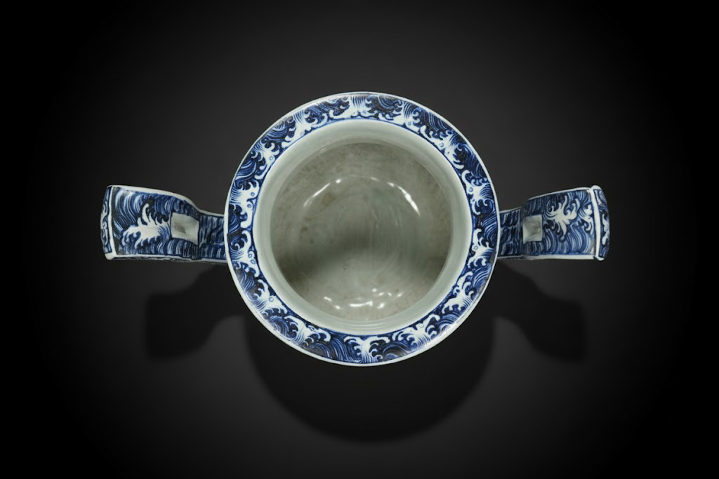 俯视炉口,呈宽沿圆形,内壁施白釉泛青,光洁细腻。口沿与双耳饰以连绵海水波纹,与炉腹主纹相呼应,视觉节奏明快,体现出明永乐官窑对对称与秩序之美的极致追求。