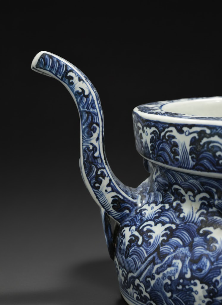 青花色泽深沉,呈现“铁锈斑”与自然晕散感,乃典型的苏麻离青料特征,既凸显立体层次,也彰显出永乐青花特有的历史气息与稀有之美。