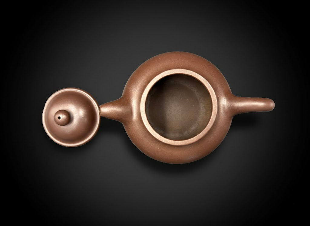 俯视图中,壶盖置于左侧,壶口圆润收敛,内壁泥质细腻,壶嘴与壶把比例精准,整体布局协调,圆中见势,气韵生动。