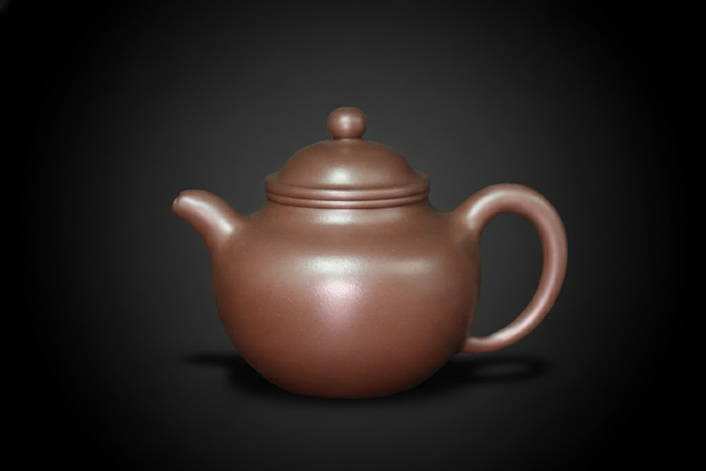侧面全貌展现出典型“掇球”结构:壶身、壶盖与壶钮呈三球叠合之势,比例严谨,过渡自然,形神兼备,尽显邵大亨壶艺的浑厚气度。