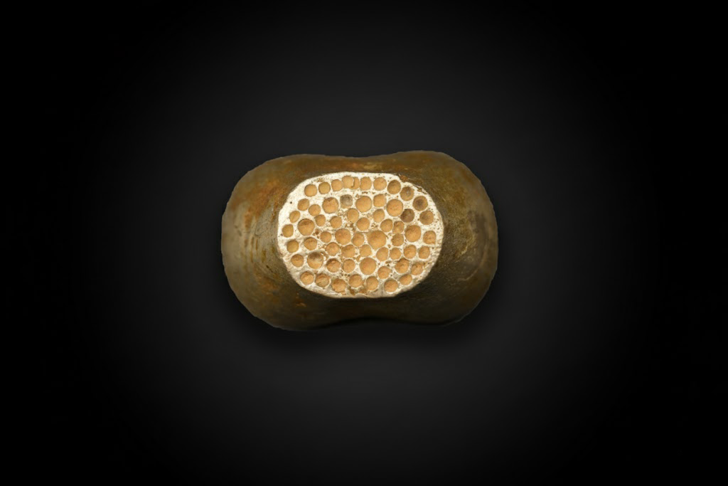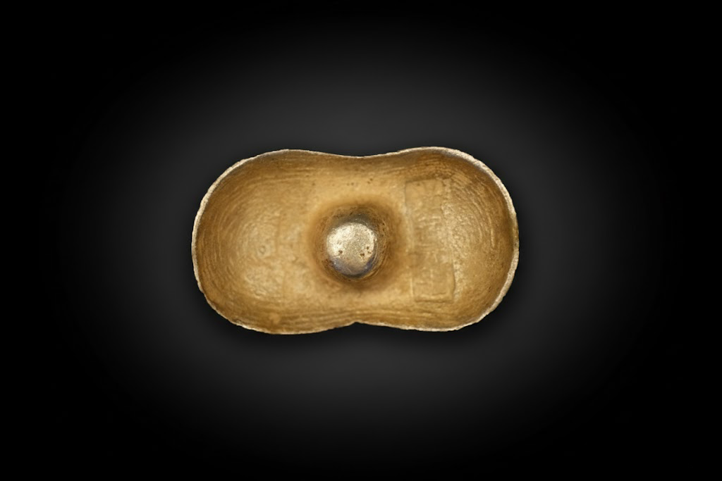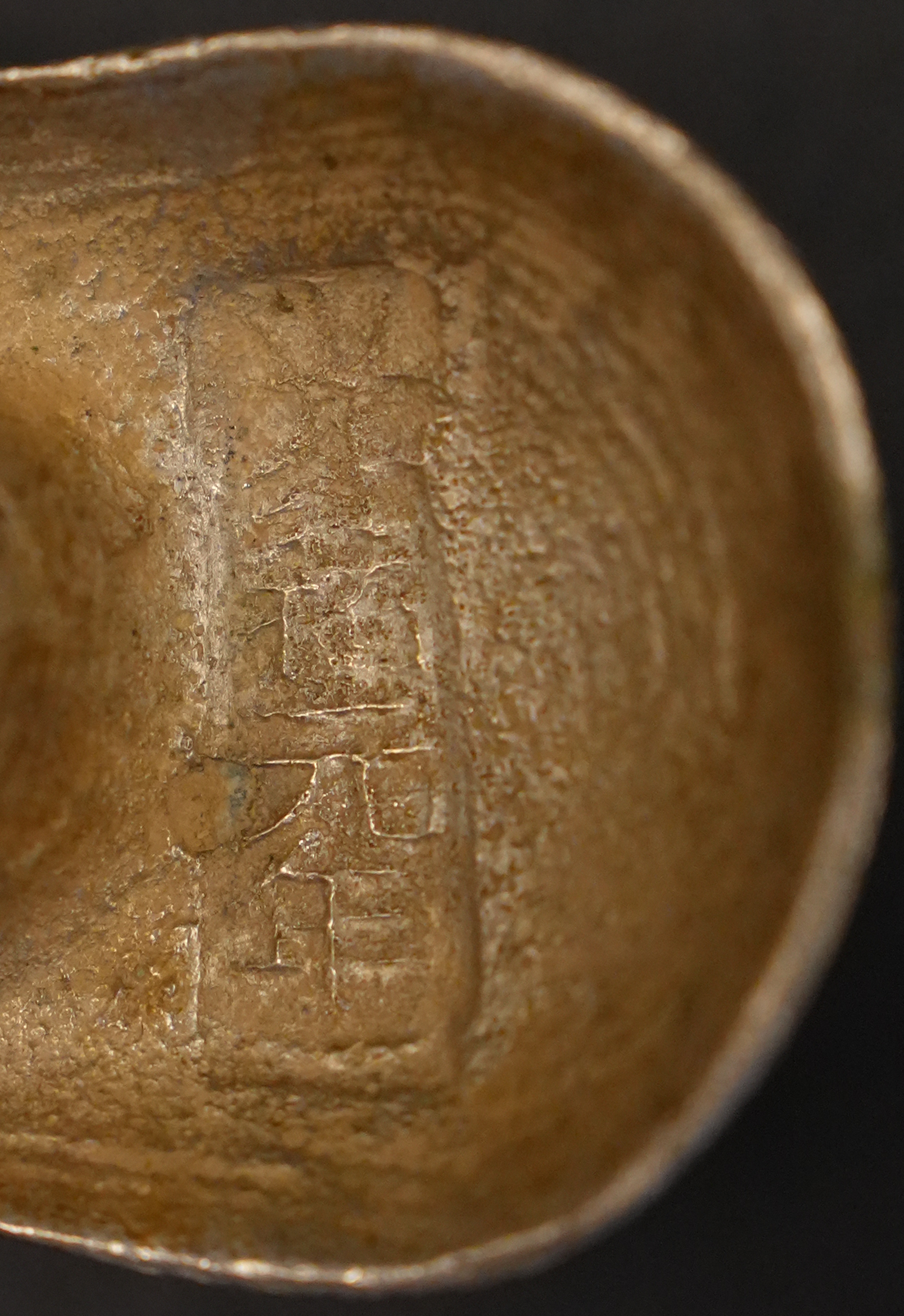 银锭底部呈花生形轮廓,中部有明显的“蜂眼”凹陷,为冷却时银液自然收缩所致,线条柔和,质感古朴,呈现出朴实自然的铸造之美。