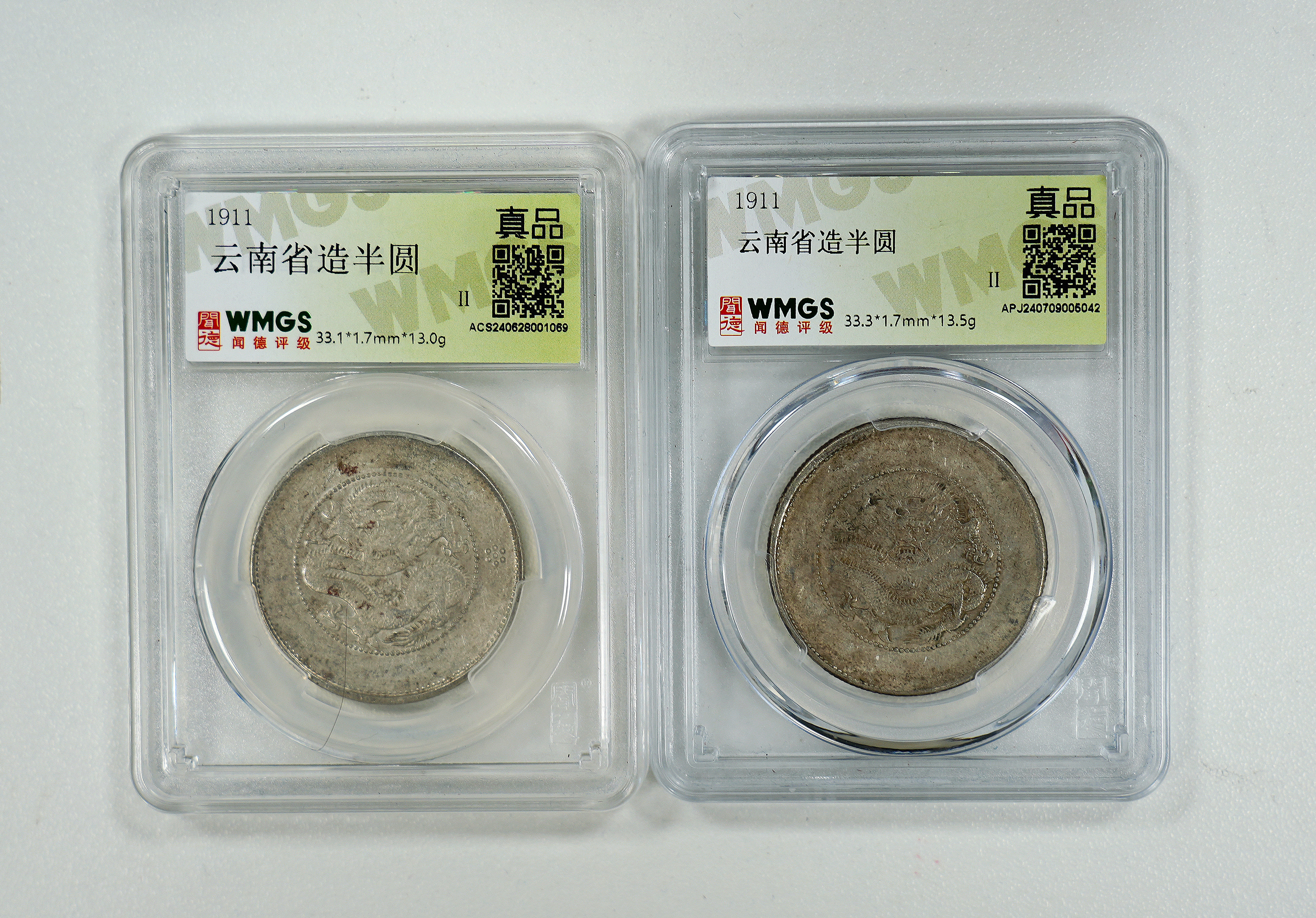 本组拍摄品为两枚封装于 WMGS 评级盒中的 1911 年(宣统三年)云南省造半圆银币;单枚直径 33.1 cm,厚度 1.7 mm,重量分别为 13.0 g 与 13.5 g;币面文字标示“光绪/宣统元宝”,币背刻“云南省造 库平三钱六分”,评级盒上带防伪全息贴,显示已接受专业封装与鉴定。