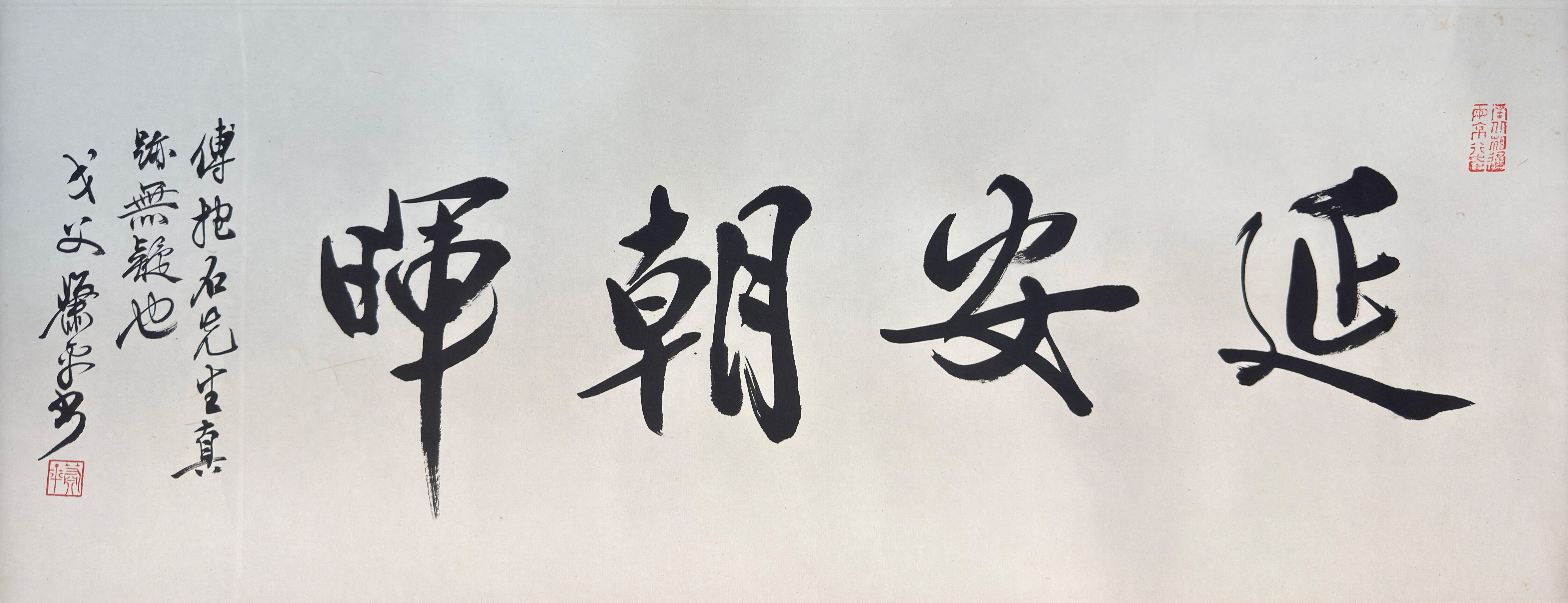 图中可见四个大字“延安朝辉”,字体雄健洒脱,为萧平所书,旁题“傅抱石先生真迹无疑 也戈父萧平书”,下钤“萧平”朱印。书法与画作相得益彰,不仅为作品注入了新的文人气息,也成为鉴赏与流传的重要依据。