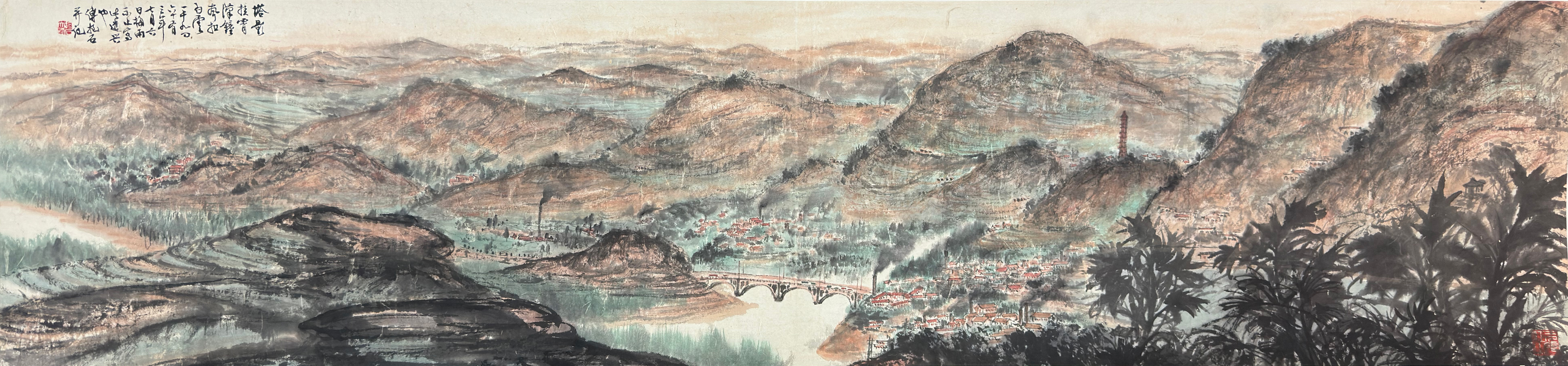 中国近现代著名画家傅抱石(1904–1965)的代表性长卷之一——《延安朝辉图》,总尺寸为 253 × 33 cm。作品整体气势宏伟、笔墨精妙,不仅展现了傅抱石以山水寄志、以笔墨咏史的艺术理想,也承载了革命圣地延安的精神象征。