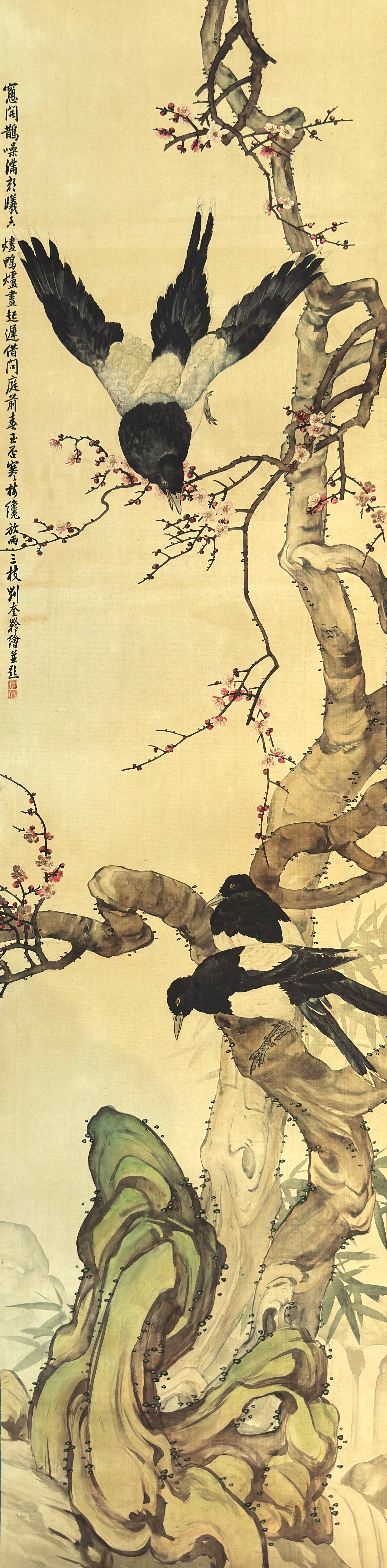 此幅以梅花与喜鹊为主景,枝干劲挺,梅花点点,疏影横斜。两只喜鹊相对而鸣,神态生动,寓意“报喜迎春”。墨枝与粉梅对比强烈,寒香之中透出生命的暖意,展现了画家细腻的用笔与情感表达。