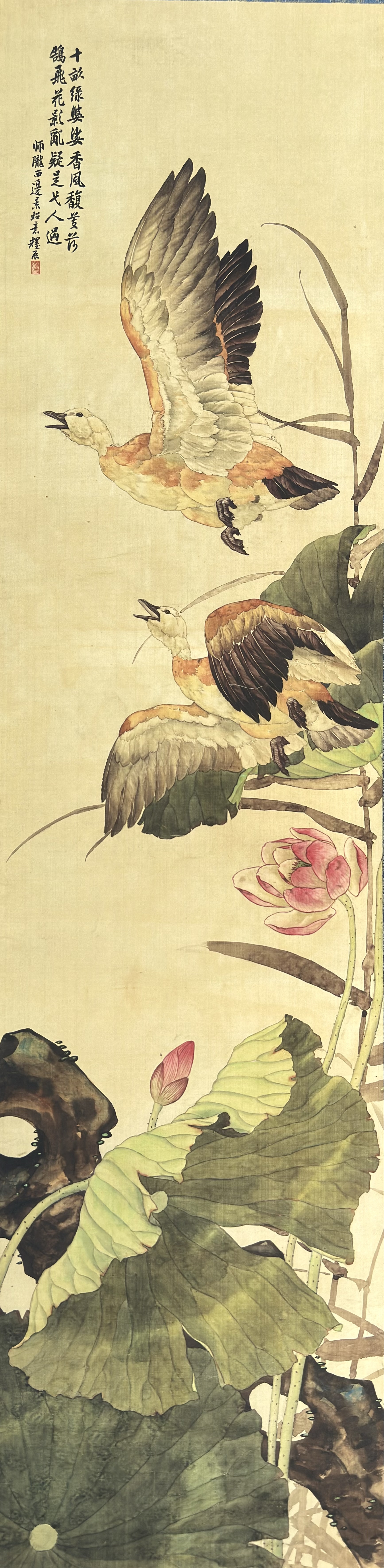 夏日荷塘之景,一动一静。赤麻鸭或展翅欲飞,或浮立荷叶,羽色层次分明,晕染精妙。荷叶浓淡相宜,荷花粉白相间,生机盎然。整幅画以温润的色调描绘出人与自然的和谐与宁静。