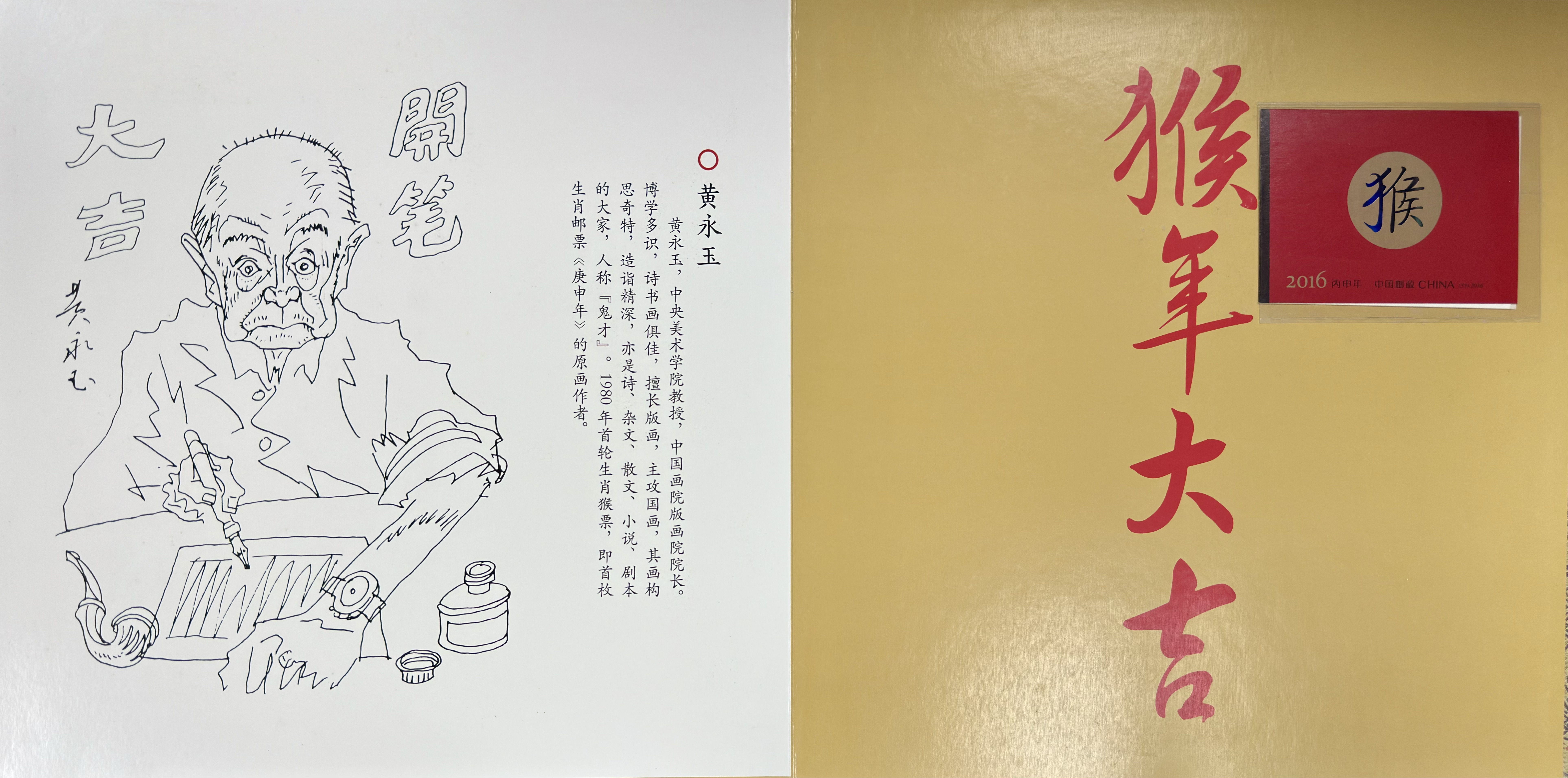 首页左侧为黄永玉先生的铅笔速写自画像,笔触老道,神采鲜活;旁题“开笔大吉”,透露幽默与祝福。右页以金底朱字写“猴年大吉”,右上嵌入邮票卡,寓意开篇见喜。