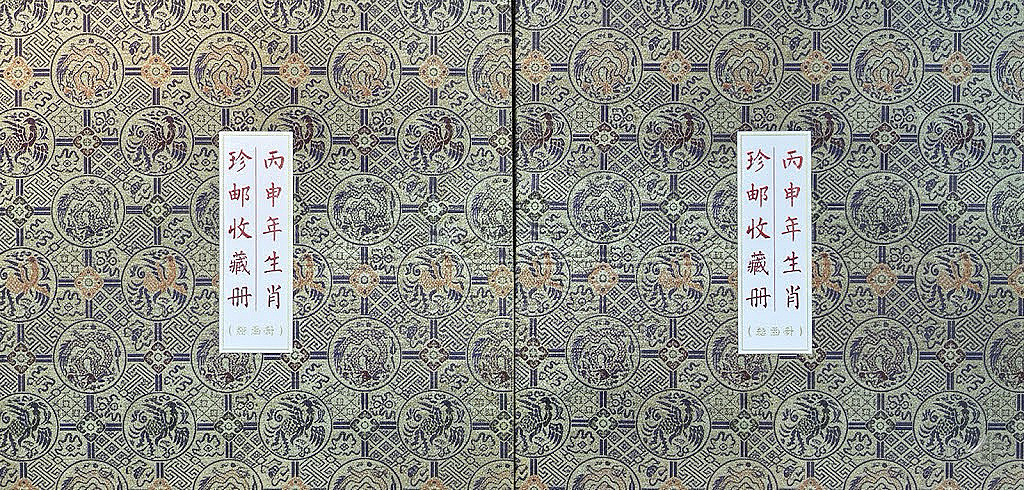 邮册封面采用布面精装设计,织纹间呈现细腻的龙凤团纹与几何纹饰,沉稳典雅。中央竖式标签标注“丙申年生肖珍邮收藏册”,简洁庄重。内封以红与金为主色,圆形徽章内“猴”字醒目,点题精准。