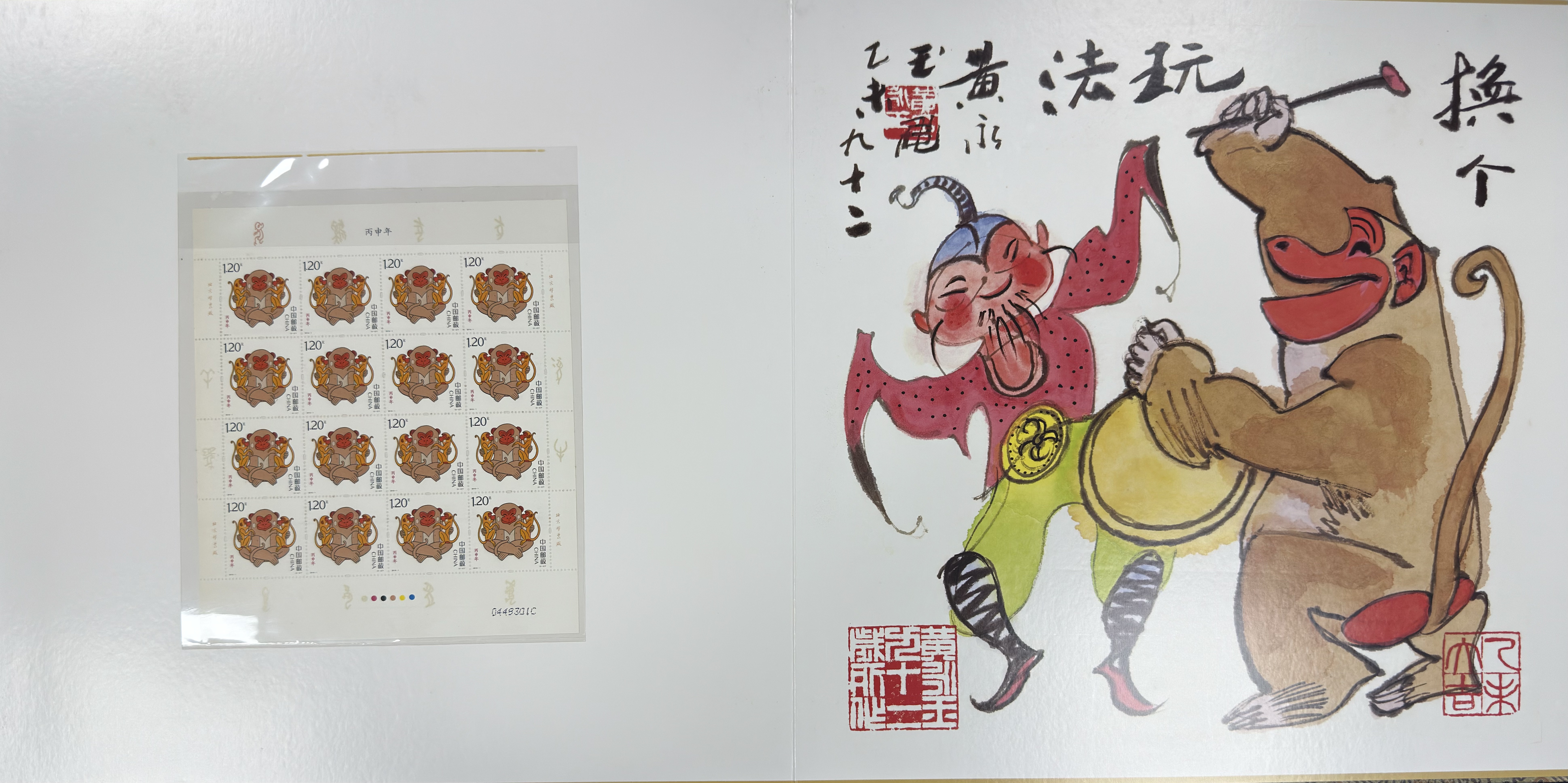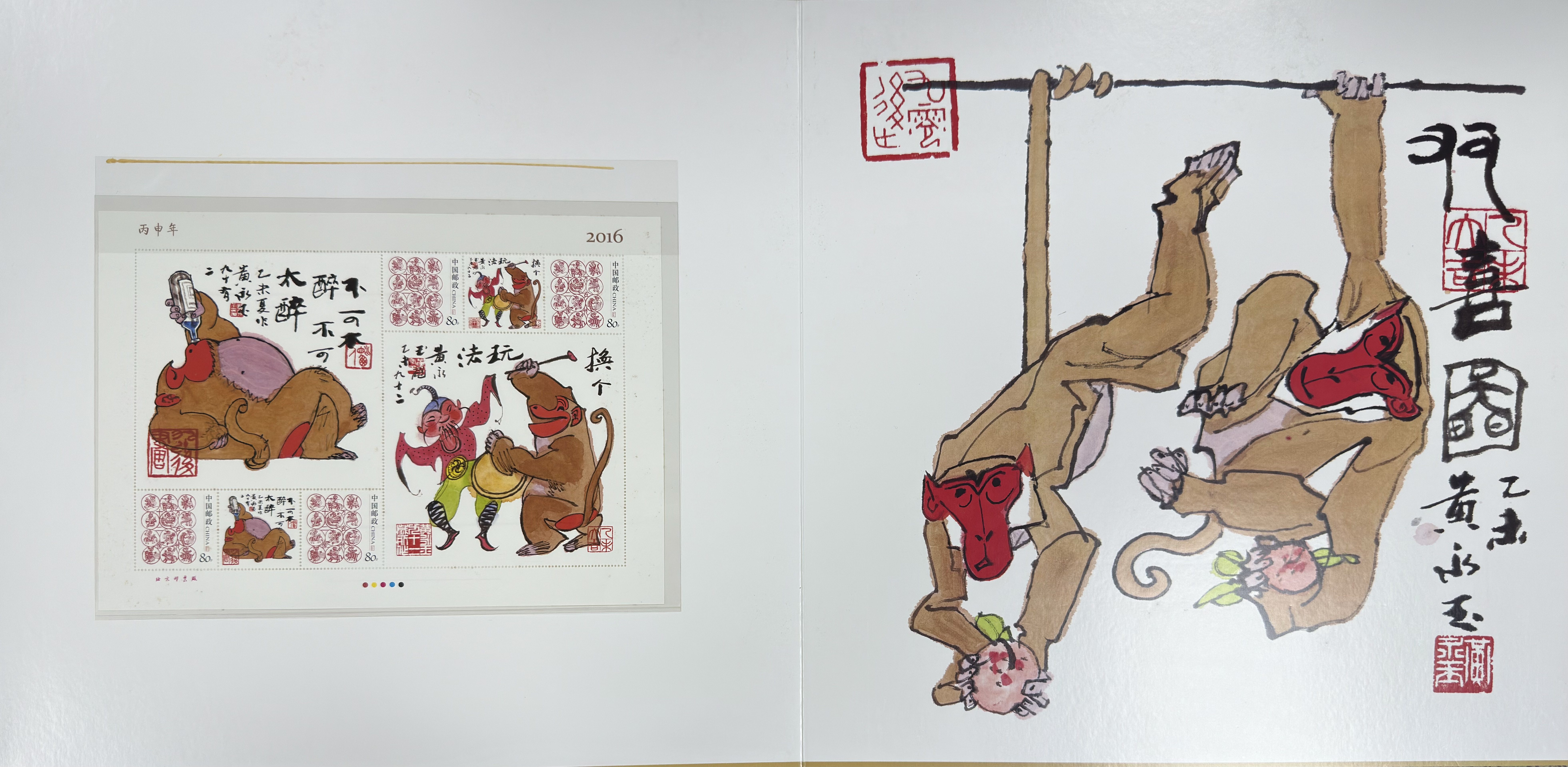 此页收录 16 枚《福寿双至》大版票,母子互动温馨自然,寓意家庭圆满。对页画作中,两只金猴敲锣打鼓,姿态喜庆热烈,黄永玉的题字奔放豪迈,让画面充满节庆氛围。