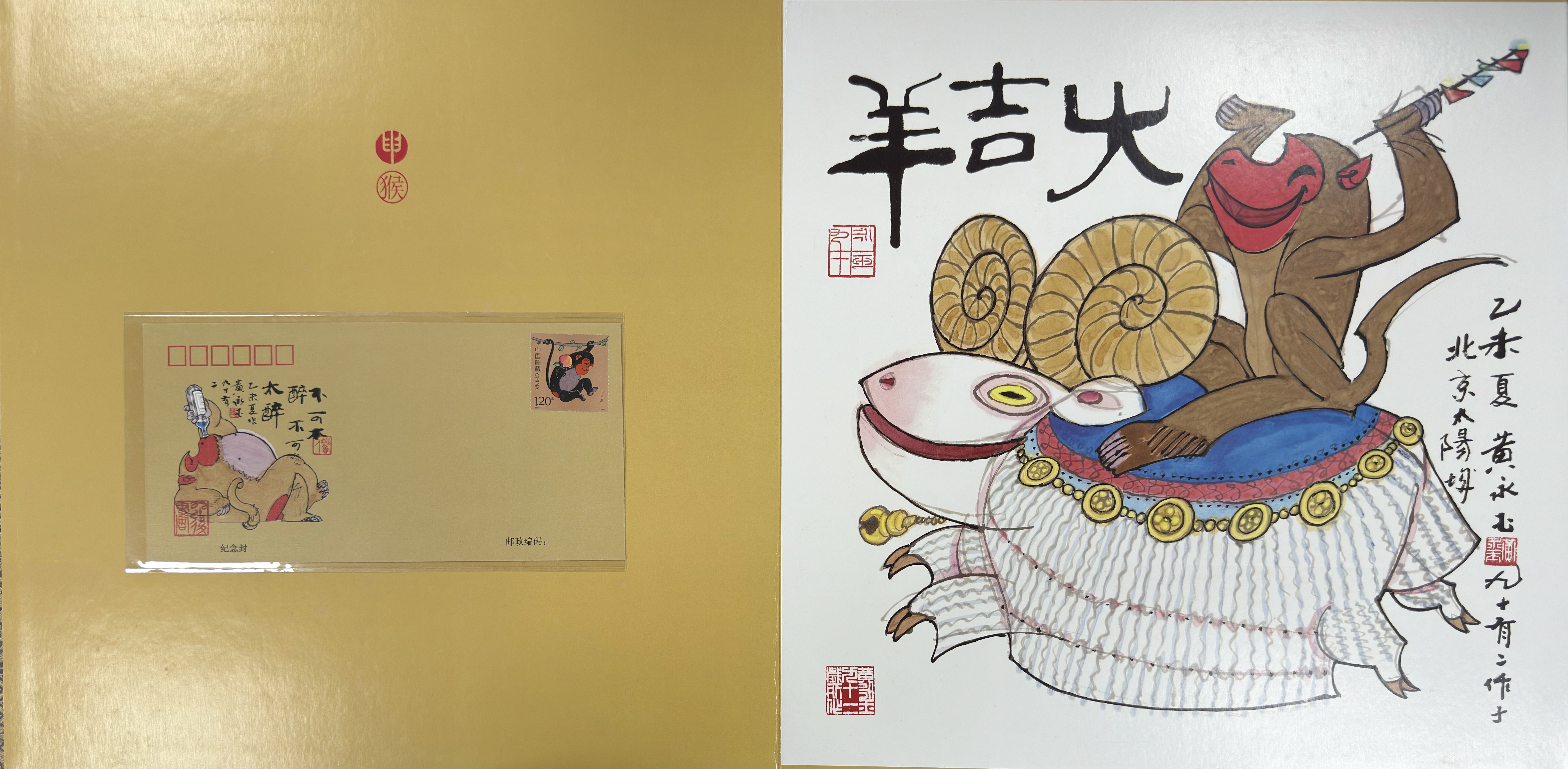 尾页嵌入首日封或纪念封,带有邮戳,为整册增添重要的时间凭证。右页为一幅趣味十足的彩绘:猴子骑于羊背之上,高举彩旗,寓意大吉大利。落款“未夏 黄永玉 九十有二作”显示出艺术家 92 岁仍保持充沛的创作活力。