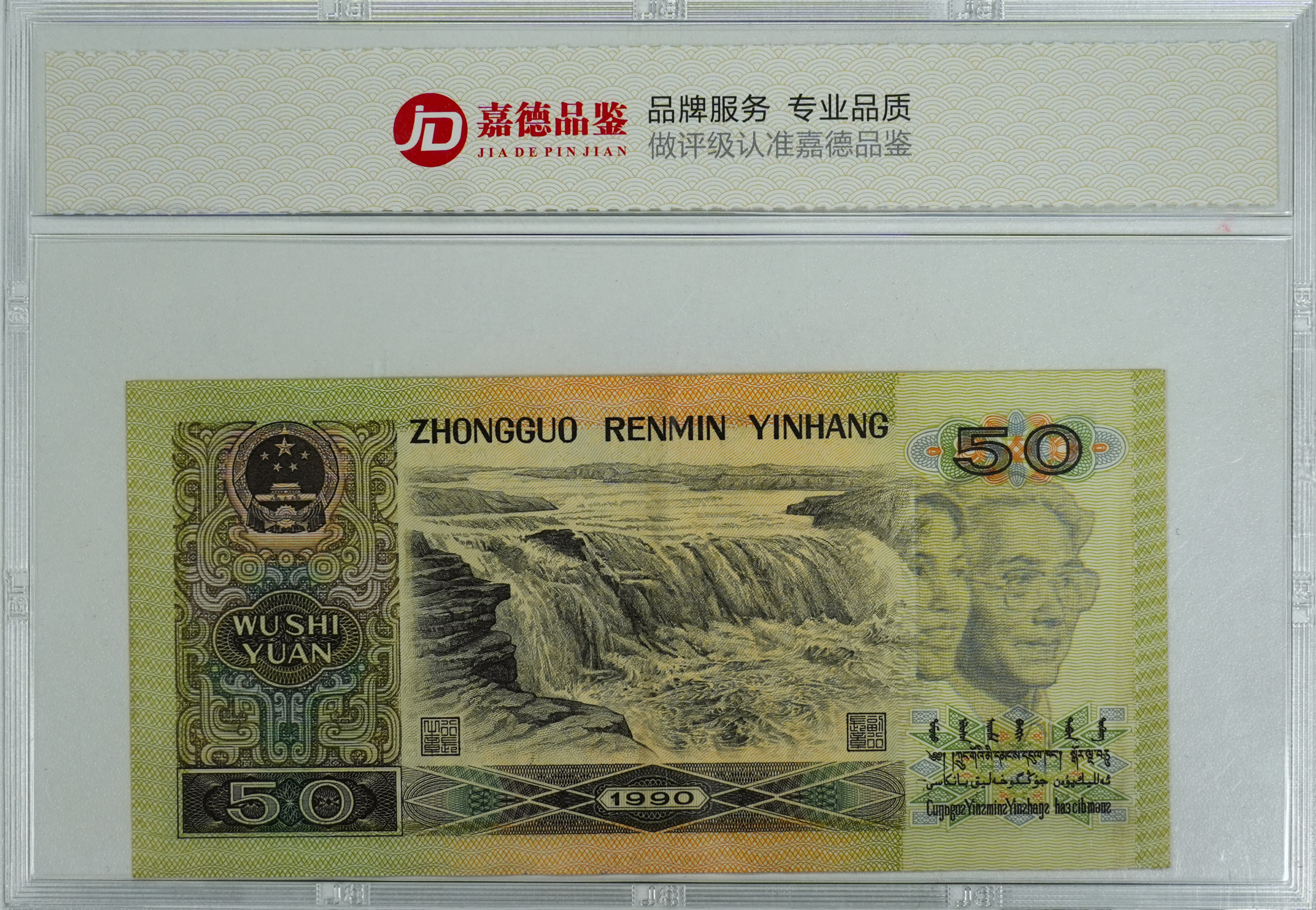 此为1990年版伍拾圆纸币的背面,主景图案为雄伟壮观的黄河壶口瀑布图,底部印有“1990”年号。封装壳上的“嘉德品鉴 品牌服务 专业品质”字样,体现了其经过专业评级的品质保障。