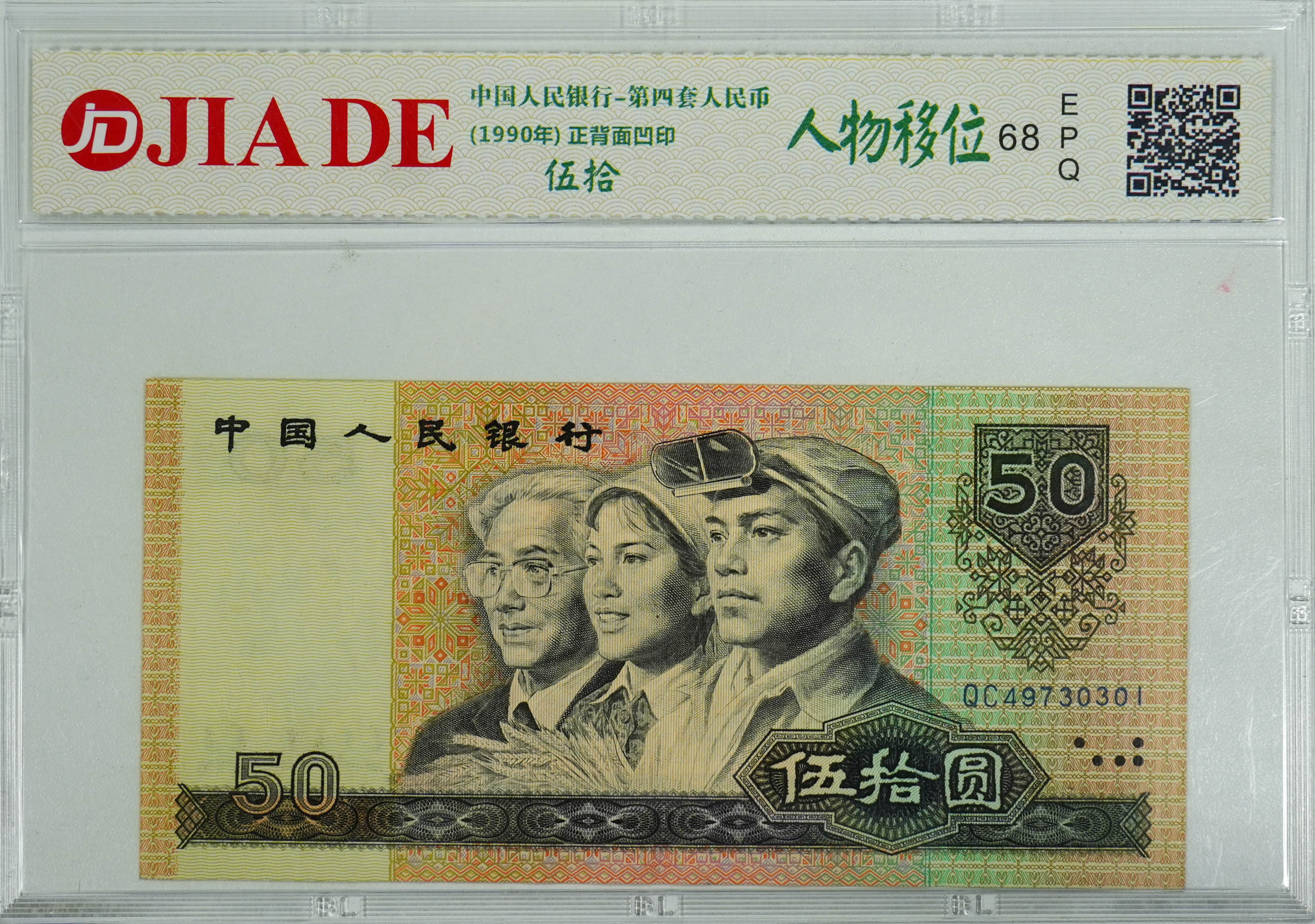 此为1990年版伍拾圆纸币的正面,主题为工人、农民、知识分子头像。该纸币经过JD嘉德鉴定,标签清晰指出“人物移位”的错版特征,即正面人物头像的位置出现了异常偏移。