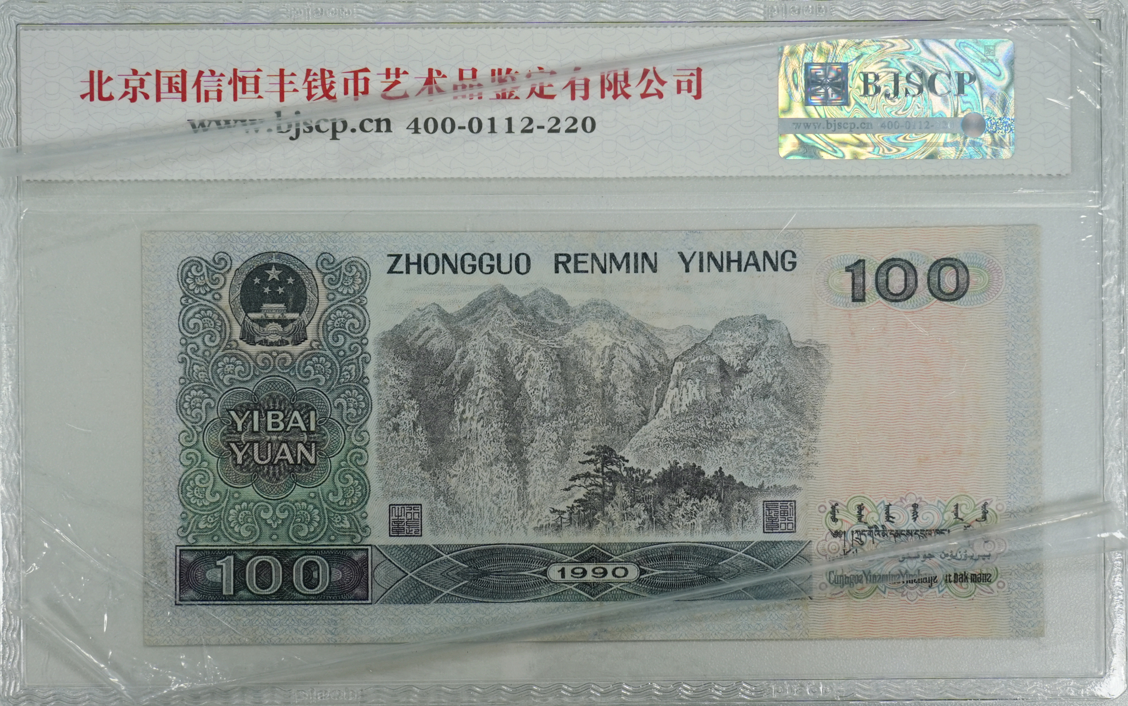 此为1990年版壹佰圆纸币的背面,主景图案是井冈山主峰图,票面中部印有“1990”年号。封装壳上的信息显示该币经过BJSCP国信鉴定,进一步证实了其真品和特征。