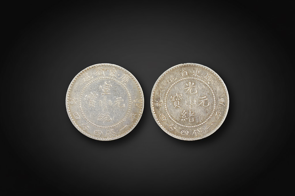 右侧为光绪元宝,中央铸“光绪元宝”四字,外圈注明发行省份及面值"库平一钱四分四厘",并环以满文;左侧为宣统元宝,同样以“宣统元宝”为币文,布局规整,刀痕清晰。两币体现出清末银元的标准化工艺,是当时主要的流通货币之一。