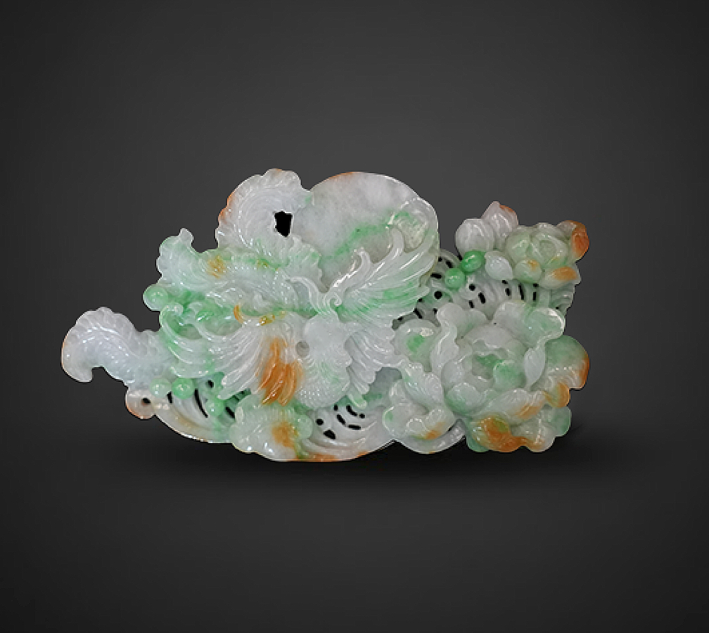 作品上部以如意云纹环绕流转,与凤凰、花卉自然衔接,象征事事如意、福运绵长。玉质细腻温润,抛光精致,折射出翡翠特有的灵动光感。