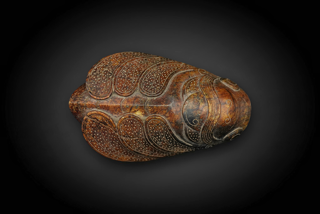 蝉自古象征高洁、复生与永恒。战国时期玉蝉多用作“琀玉”,寓意灵魂升华与生命延续。这件玉蝉体量远超常规,推测为贵族身份佩玉,兼具精神与地位双重象征。