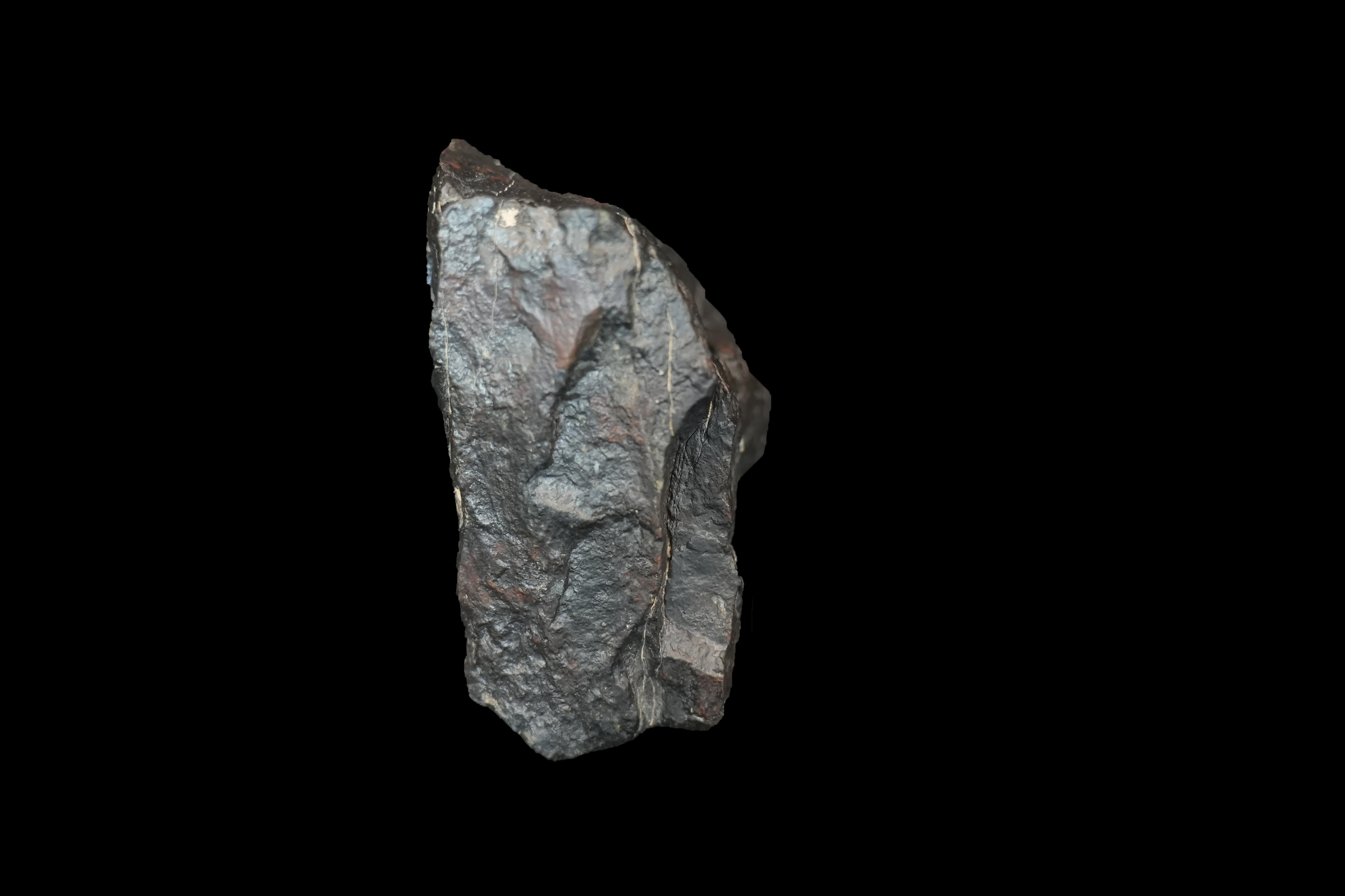 侧面图展示了陨石外层的深棕至黑色熔壳(fusion crust)。这是岩体穿越大气层时经高温摩擦熔化并迅速冷却形成的玻璃质层。表面凹凸不平、质感坚硬,清晰记录了它与地球大气剧烈摩擦时的灼烧痕迹。