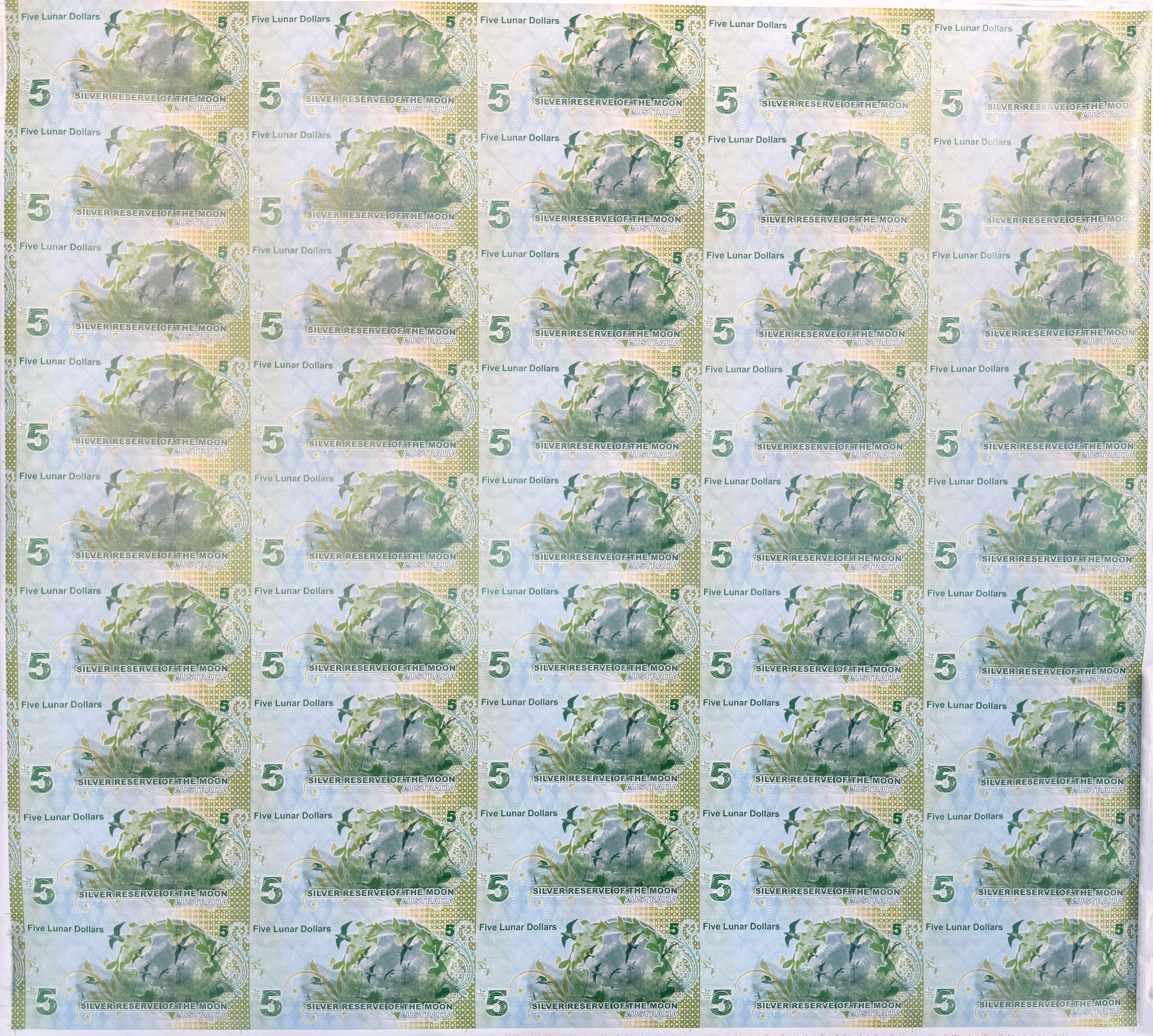 背面主题为“月球银储备”(Silver Reserve of the Moon),图案以月球地貌与抽象纹饰为主,色调柔和,充满梦幻感与太空意象。整版同样包含 48 枚 $5$ 月银元钞票,与正面形成呼应,体现出从探索地球到仰望星空的浪漫构想。