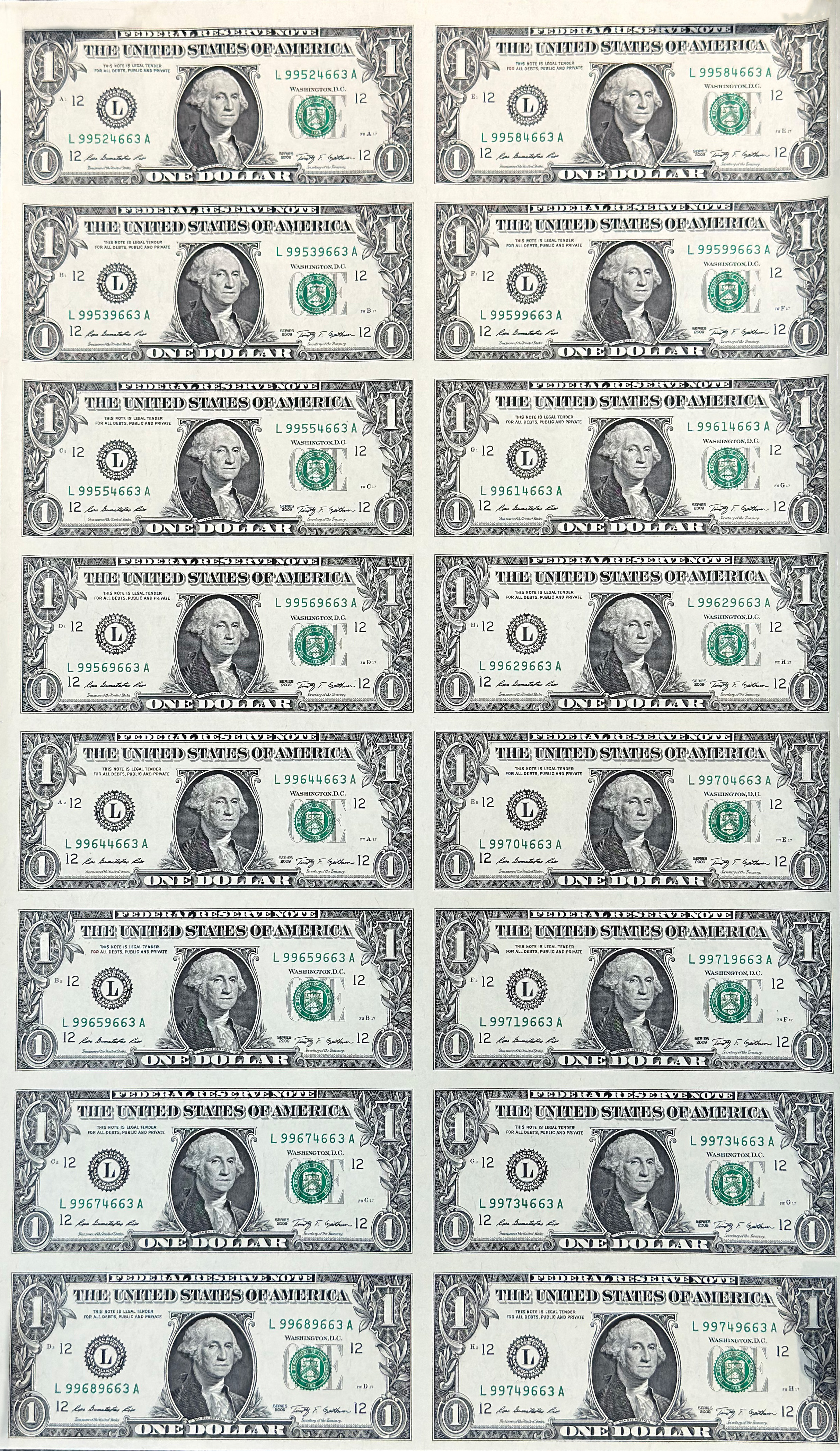 每张纸币正中为美国首任总统乔治·华盛顿肖像,下方印有面值“ONE DOLLAR”。整版纸币印有连贯的序列号、财政部印章、联邦储备银行印章与签名,展示了美国钞票设计的严谨与庄重。未裁切的连号序列更是体现其“原版整出”的收藏特征。