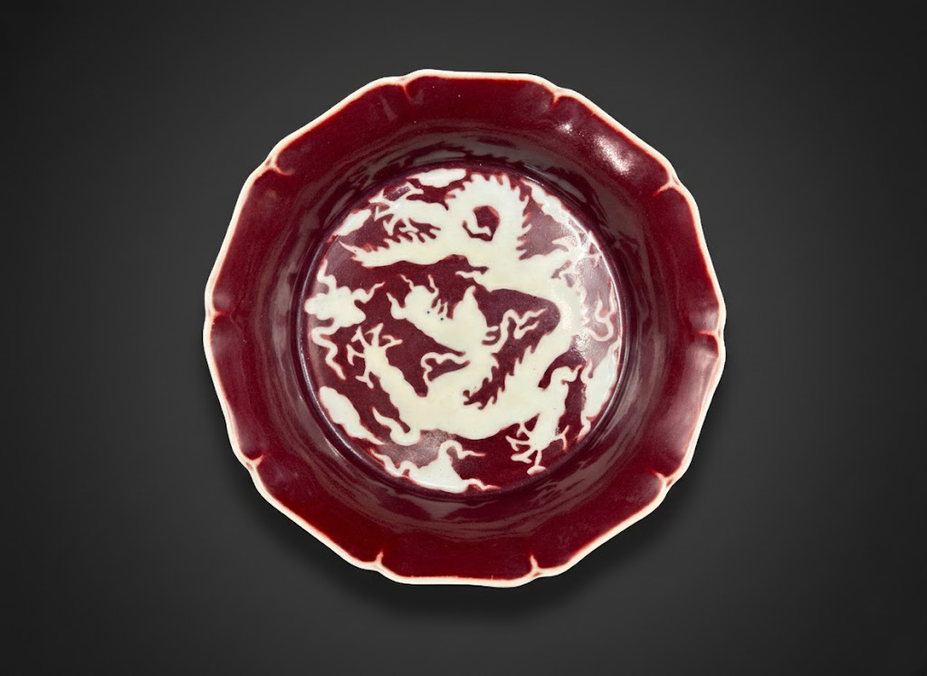 宣德时期的霁红釉是铜红釉发展史上的高峰。其色泽纯正、光润如玉,烧造难度极高。此盘将霁红釉与刻白龙纹相结合,构图庄重、工艺考究,红白相融,动静相宜。