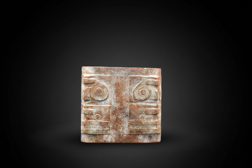 俯瞰之下,内孔圆滑、外壁方正,圆方对比鲜明。表面带红褐与灰白沁色,岁月痕迹交织,展现了千年玉器的古韵与厚重质感。