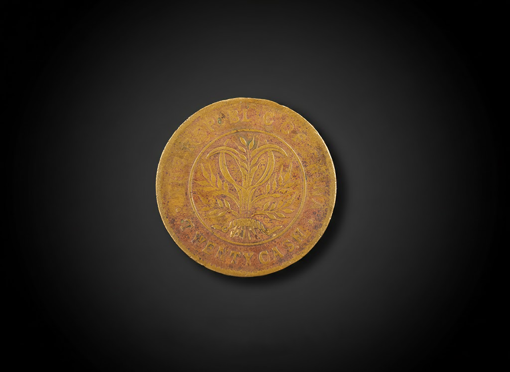 中心图案为嘉禾双穗,象征丰收与安康。外圈英文“REPUBLIC OF CHINA TWENTY CASH”完整清晰,展现中西合璧的币面设计。币面略有锈蚀与污迹,自然包浆让岁月的痕迹更添古朴。
