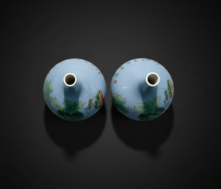 瓶身通体施以柔和的天蓝釉,釉色匀净细腻,光泽温润如玉。装饰采用精致的珐琅彩工艺,画面描绘“瓜瓞绵绵、蝴蝶翩跹”的吉祥图案,寓意福寿连绵、生机永续。色彩明丽雅致,笔触细腻生动,尽显清代官窑工艺之美。