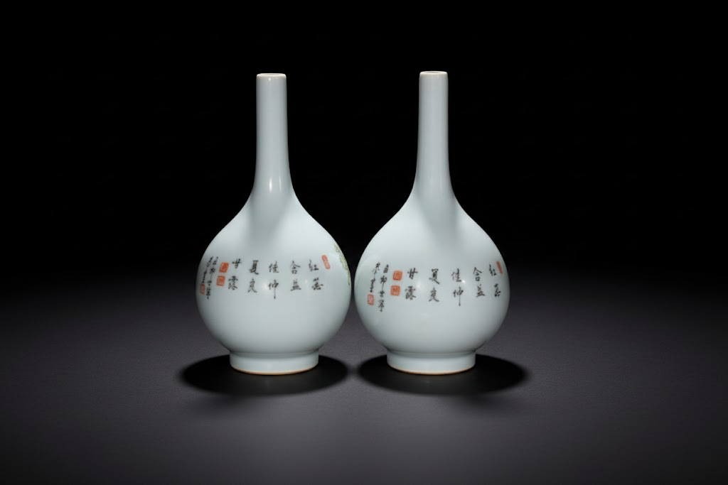 这对直颈珐琅彩胆瓶胎质细腻、釉色温润、彩绘雅致,格调高洁,体现了清代制瓷艺术的精湛工艺与文人气韵,实为陈设与鉴赏中的雅致珍品。