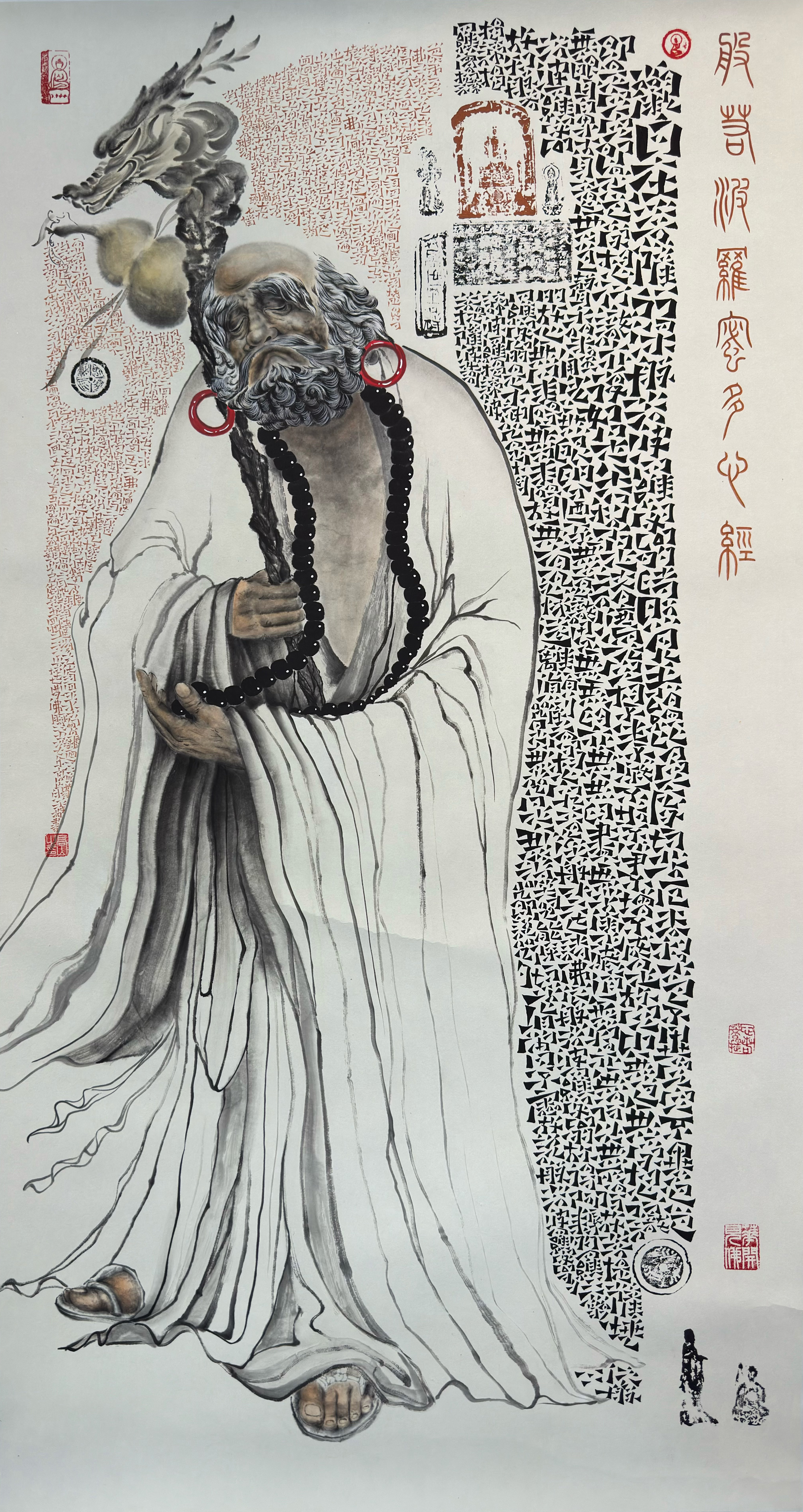 这幅名为《达摩祖师心经画》的水墨人物画,尺寸为 127cm×68.3cm。作品以禅宗初祖达摩(菩提达摩)为主角,融合了佛教经典《般若波罗蜜多心经》的文字意境,笔墨洒脱而气势宏阔。画家以现代构图重释传统题材,将宗教精神与艺术形式融为一体,构建出一幅充满力量与思辨的东方画卷。
