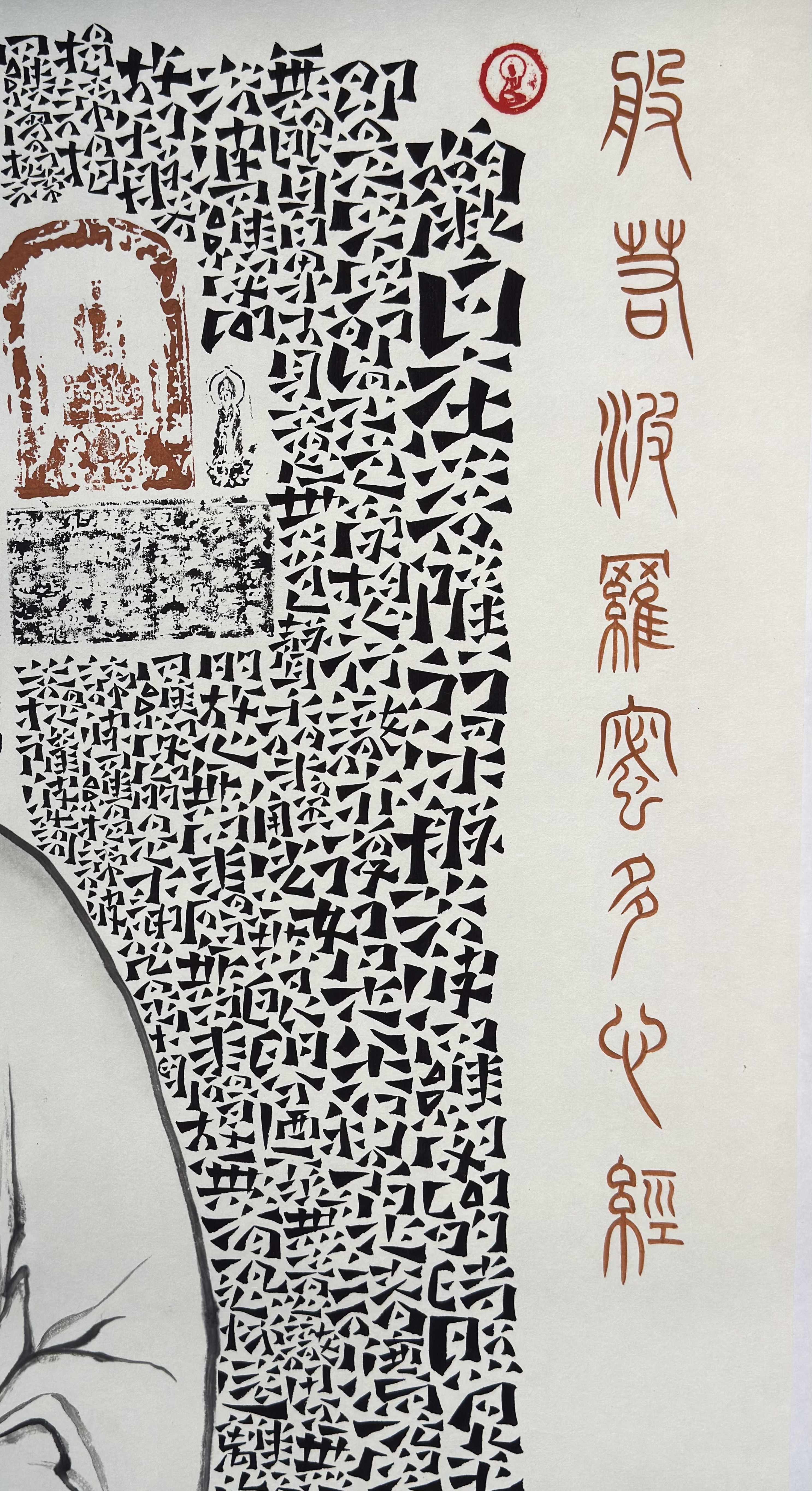 以浓墨泼洒构成抽象的文字与图形结构,笔势奔放,节奏自由。黑色“文字瀑布”由上而下倾泻,与下方细腻的衣纹线条形成虚实对照。右上角一方朱印醒目古雅,印旁两道人影若隐若现,似观者、似弟子,于静观之中映出觉悟与传承的深意。整幅局部将抽象与具象并置,构成丰富的精神空间。