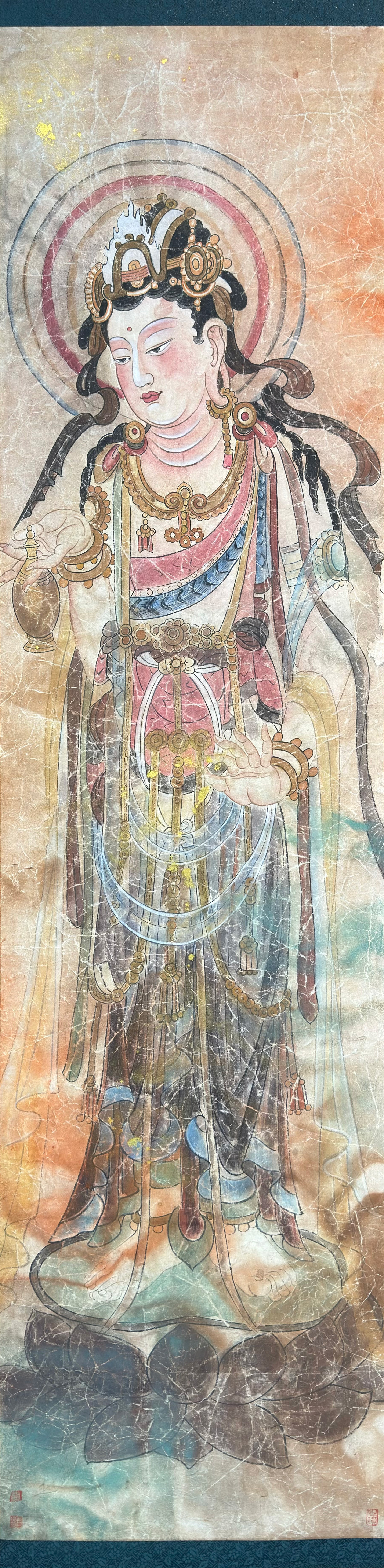 这幅敦煌风格观音壁画(尺寸139.3cm × 34.3cm),比例修长,线条细腻柔和,展现了盛唐至五代时期典型的佛教造像艺术气韵。画面以古朴的赭红、青绿为主色,纸张或绢本略显斑驳,带有岁月痕迹与壁画残存的沧桑美感。整幅作品体现了古代绘师在宗教信仰与艺术造诣之间的完美平衡。