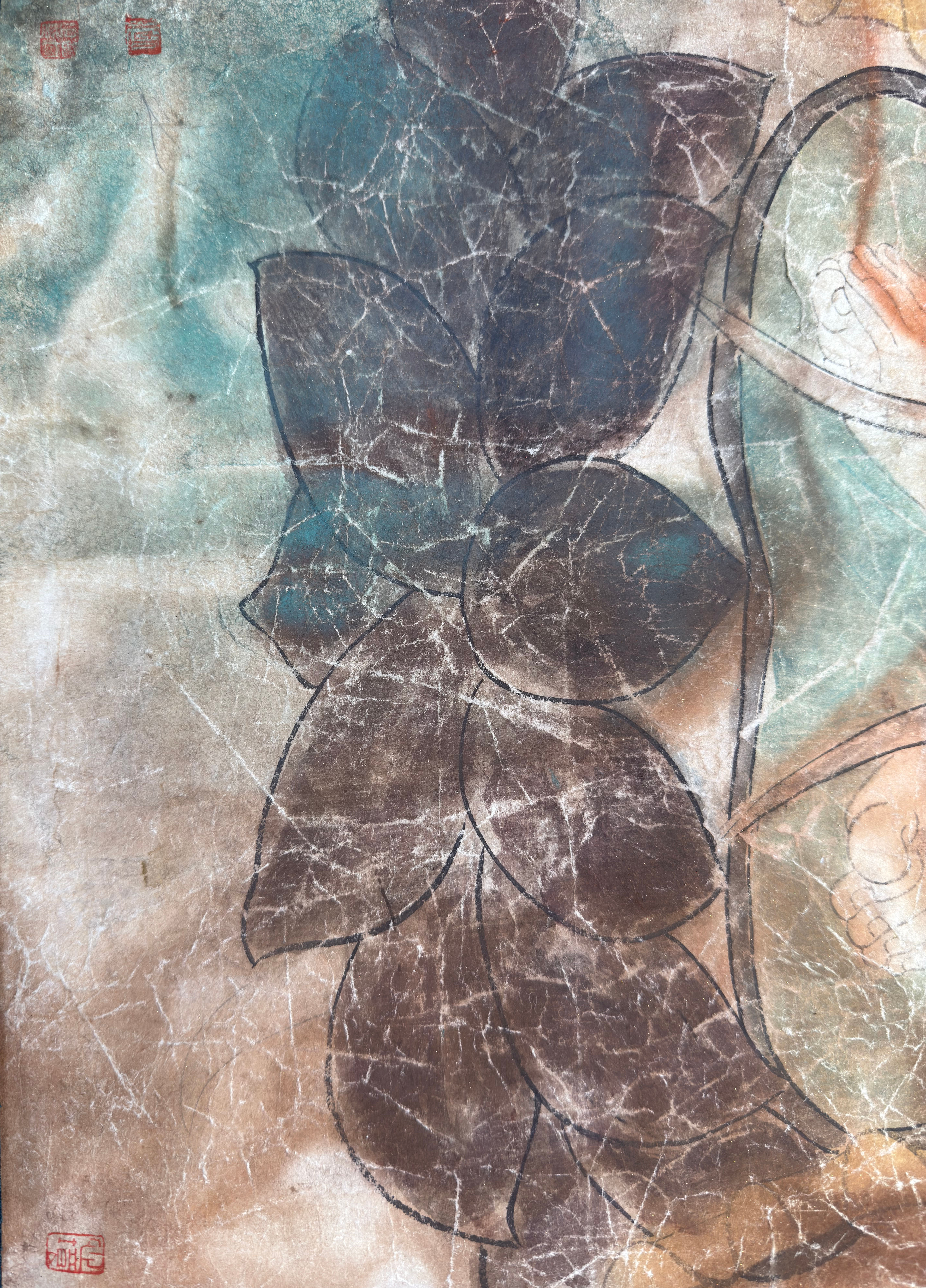 画作下部为菩萨所立莲台,莲瓣以深褐与墨线勾勒,层次分明。背景青黄相映,裂纹肌理自然,仿佛壁画剥蚀后的真实质感。画面中可见朱红印章,或为画师款印或旧藏印记,为作品的历史传承增添更多线索。