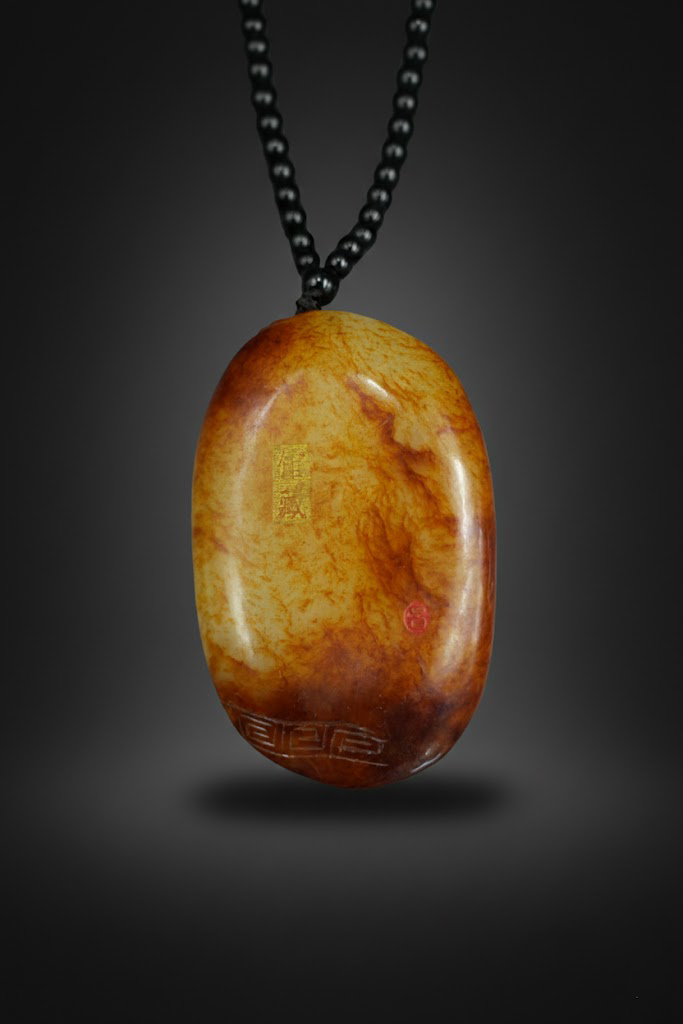 玉佩背面呈黄褐色“糖皮”质感,表面光洁柔润。中央刻有金色篆书,下方饰以回纹,线条稳重古雅。右上角的朱砂小印增添典雅书卷气。