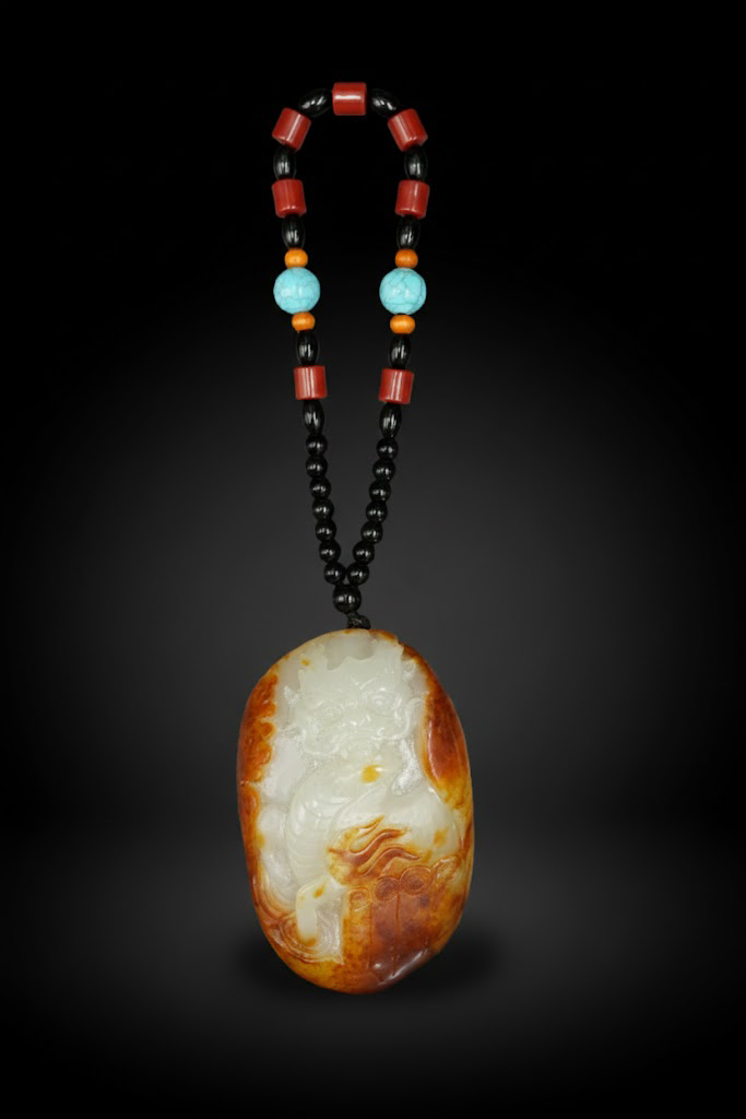 以温润白玉为主,浮雕麒麟昂首挺立,鬃毛飘逸、神态生动。外围厚重的糖皮衬托出瑞兽灵动之姿。挂链由黑珠、红筒珠与天蓝色圆珠(疑为绿松石)组成,搭配和谐。